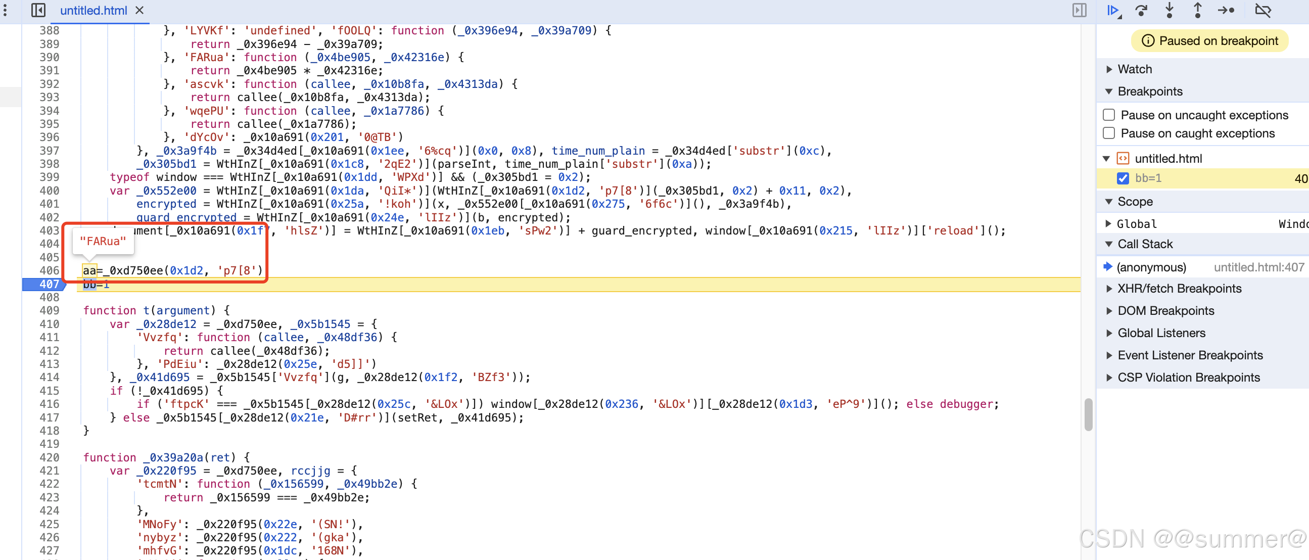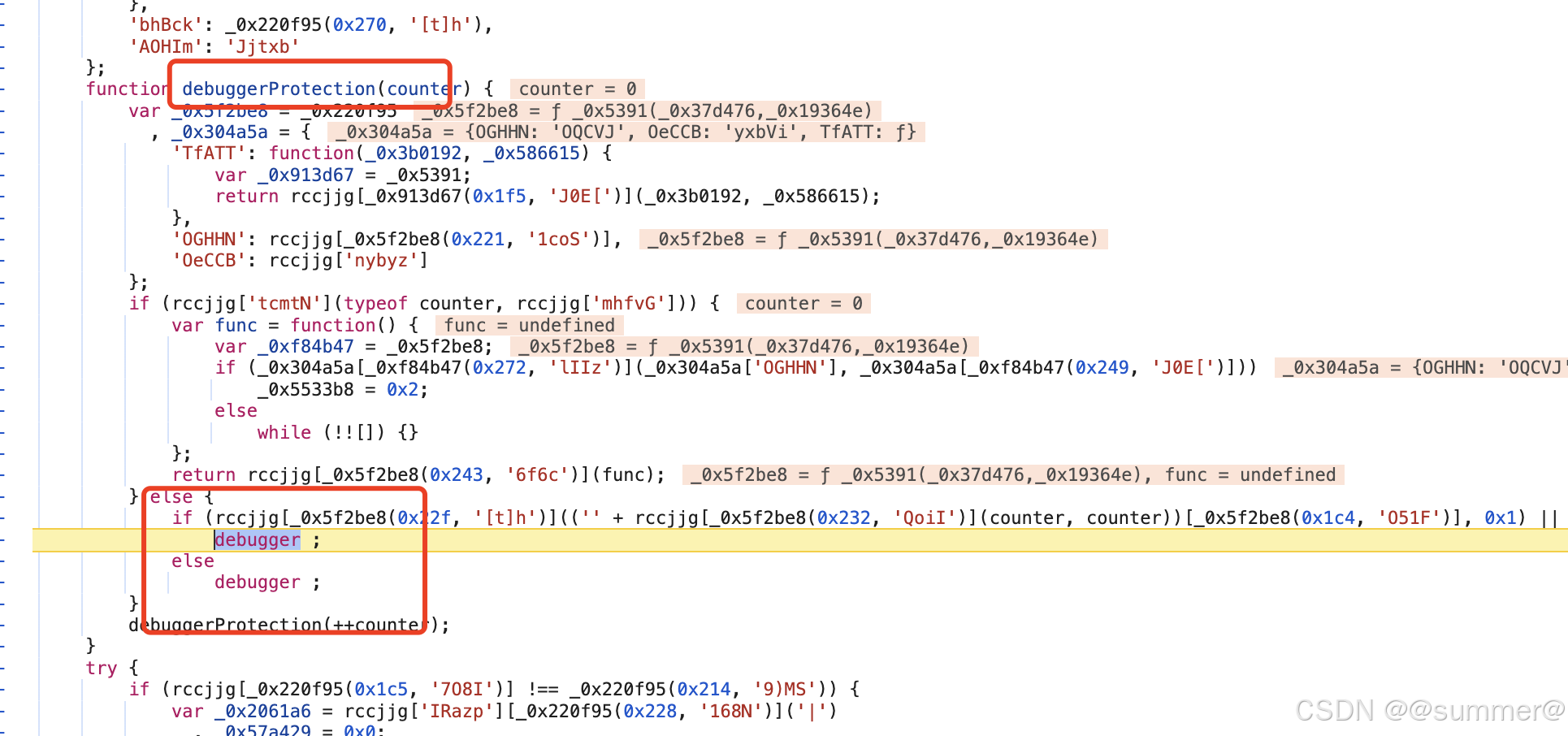 var _0xd750ee = _0x5391; function setRet(_0x34d4ed) { var _0x10a691 = _0xd750ee, WtHInZ = { 'GIeQp': function (callee, _0xf9e2d4) { return callee(_0xf9e2d4); }, 'LYVKf': 'undefined', 'fOOLQ': function (_0x396e94, _0x39a709) { return _0x396e94 - _0x39a709; }, 'FARua': function (_0x4be905, _0x42316e) { return _0x4be905 * _0x42316e; }, 'ascvk': function (callee, _0x10b8fa, _0x4313da) { return callee(_0x10b8fa, _0x4313da); }, 'wqePU': function (callee, _0x1a7786) { return callee(_0x1a7786); }, 'dYcOv': _0x10a691(0x201, '0@TB') }, _0x3a9f4b = _0x34d4ed[_0x10a691(0x1ee, '6%cq')](0x0, 0x8), time_num_plain = _0x34d4ed['substr'](0xc), _0x305bd1 = WtHInZ[_0x10a691(0x1c8, '2qE2')](parseInt, time_num_plain['substr'](0xa)); typeof window === WtHInZ[_0x10a691(0x1dd, 'WPXd')] && (_0x305bd1 = 0x2); var _0x552e00 = WtHInZ[_0x10a691(0x1da, 'QiI*')](WtHInZ[_0x10a691(0x1d2, 'p7[8')](_0x305bd1, 0x2) + 0x11, 0x2), encrypted = WtHInZ[_0x10a691(0x25a, '!koh')](x, _0x552e00[_0x10a691(0x275, '6f6c')](), _0x3a9f4b), guard_encrypted = WtHInZ[_0x10a691(0x24e, 'lIIz')](b, encrypted); document[_0x10a691(0x1f7, 'hlsZ')] = WtHInZ[_0x10a691(0x1eb, 'sPw2')] + guard_encrypted, window[_0x10a691(0x215, 'lIIz')]['reload'](); } 里面的很多代码都看不出是啥东西,不过没关系,我们可以让浏览器帮我们翻译,首先把无限debug的代码先去掉,改成空方法即可,如下