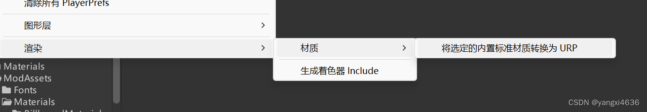 4.点击 材质(Materials),再选择 将选定的内置标准材质转换为URP(Convert Selected Built-in Materials to URP)