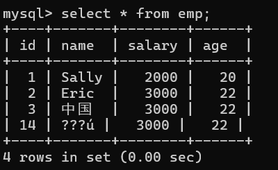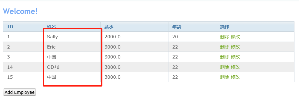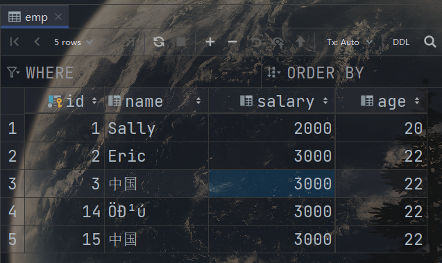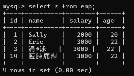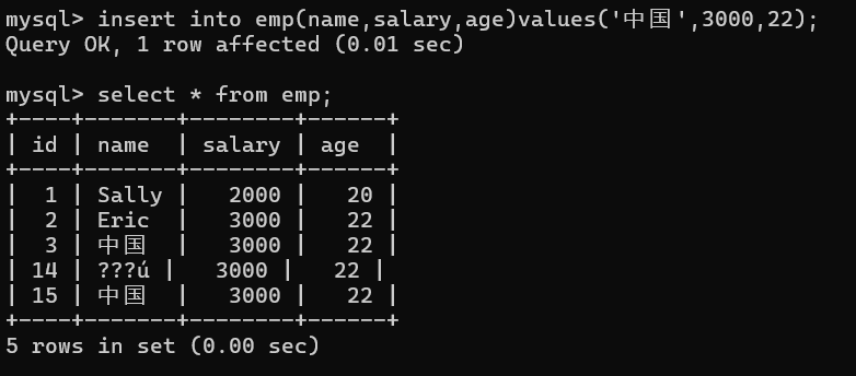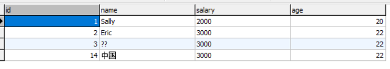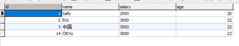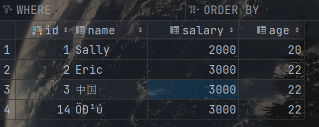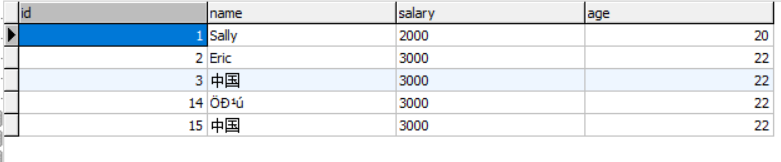 发现最后一行是所有都是乱码的,重新插入一行数据测试一下。