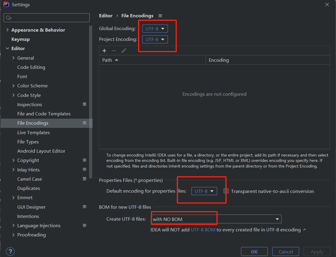 总结上述就是对于idea,修改file Encodings里面的编码,全部换成utf-8,对配置文件进行新增-Dfile.encoding=UTF-8。