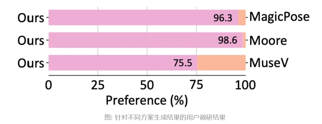 在量化指标评估实验中,MimicMotion 相比现有开源方案 MagicPose、Moore-AnimateAnyone 以及 MuseV,在 FID-VID 及 FVD 测试指标上均取得了领先。