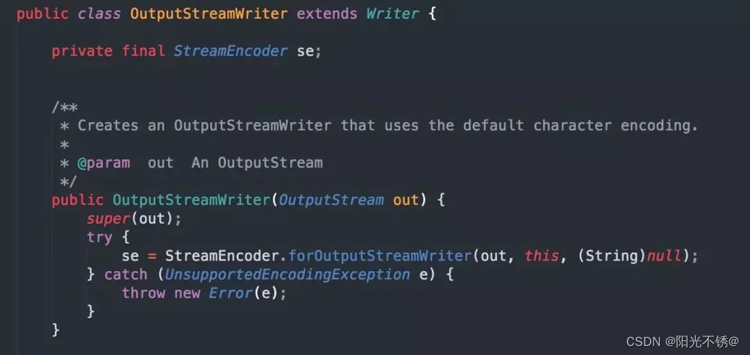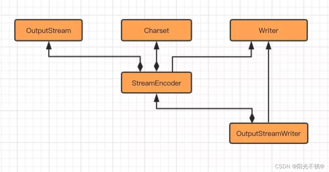 通过 OutputStreamWriter 类完成字符到字节的编码过程,由 StreamEncoder 完成编码过程。