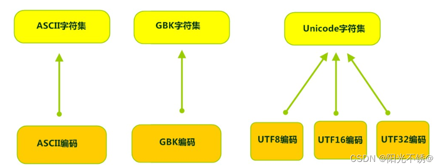 上面说的编码与解码的过程需要遵循某种规则,这种规则就是不同的字符编码。我们在刚刚学习编程的时候最早接触就是ASCII码,它主要是用来显示英文和一些符号,到后面还有接触到别的编码规则常用的有:gb2312,gbk,utf-8等。它们分别属于不同的编码集。
