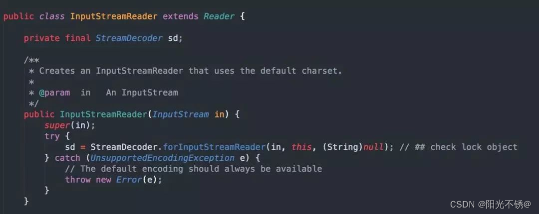 InputStream 到 Reader 的过程需要指定编码字符集,否则将采用操作系统默认字符集,很可能会出现乱码问题,StreamDecoder 则是完成字节到字符的解码的实现类。