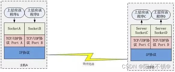 我们知道网络层使用的 IP 协议可以帮助我们根据 IP 地址来找到目标主机,但是一台主机上可能运行着多个应用程序,如何才能与指定的应用程序通信就要通过 TCP 或 UPD 的地址也就是端口号来指定。这样就可以通过一个 Socket 实例代表唯一一个主机上的一个应用程序的通信链路了。