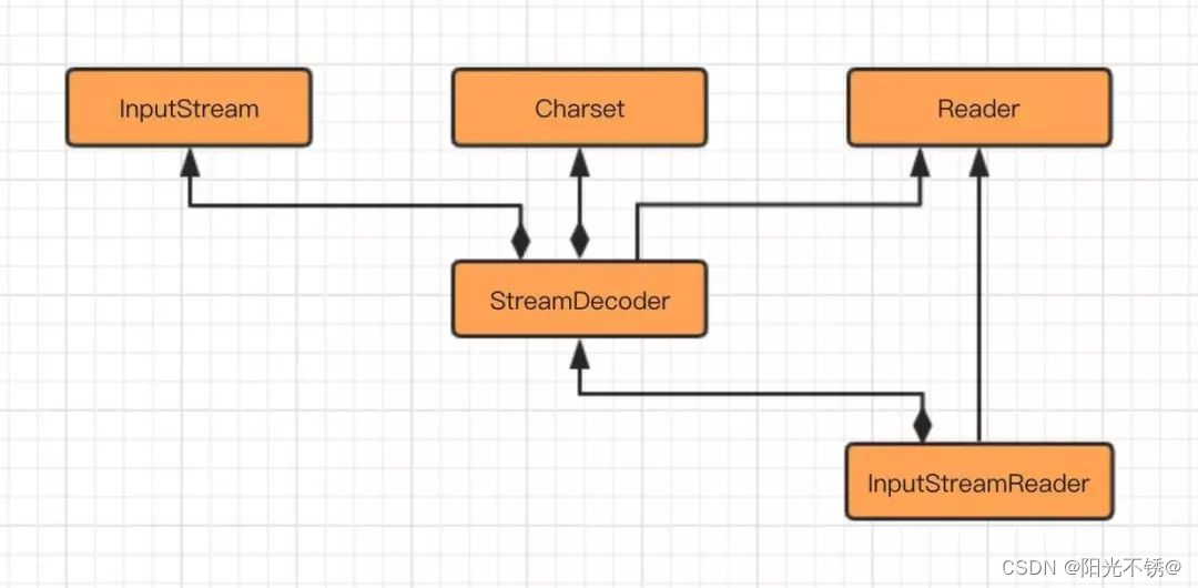 从图上可以看到,InputStreamReader 类是字节到字符的转化桥梁, 其中StreamDecoder指的是一个解码操作类,Charset指的是字符集。