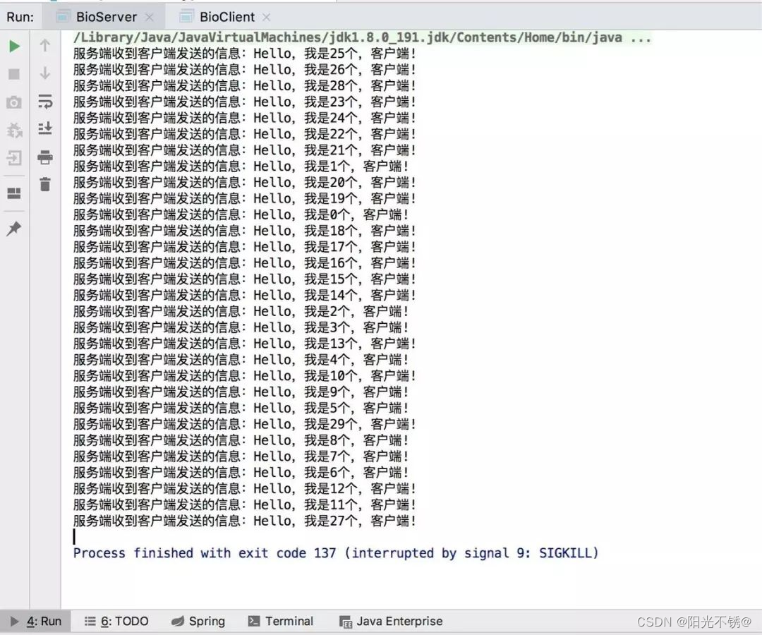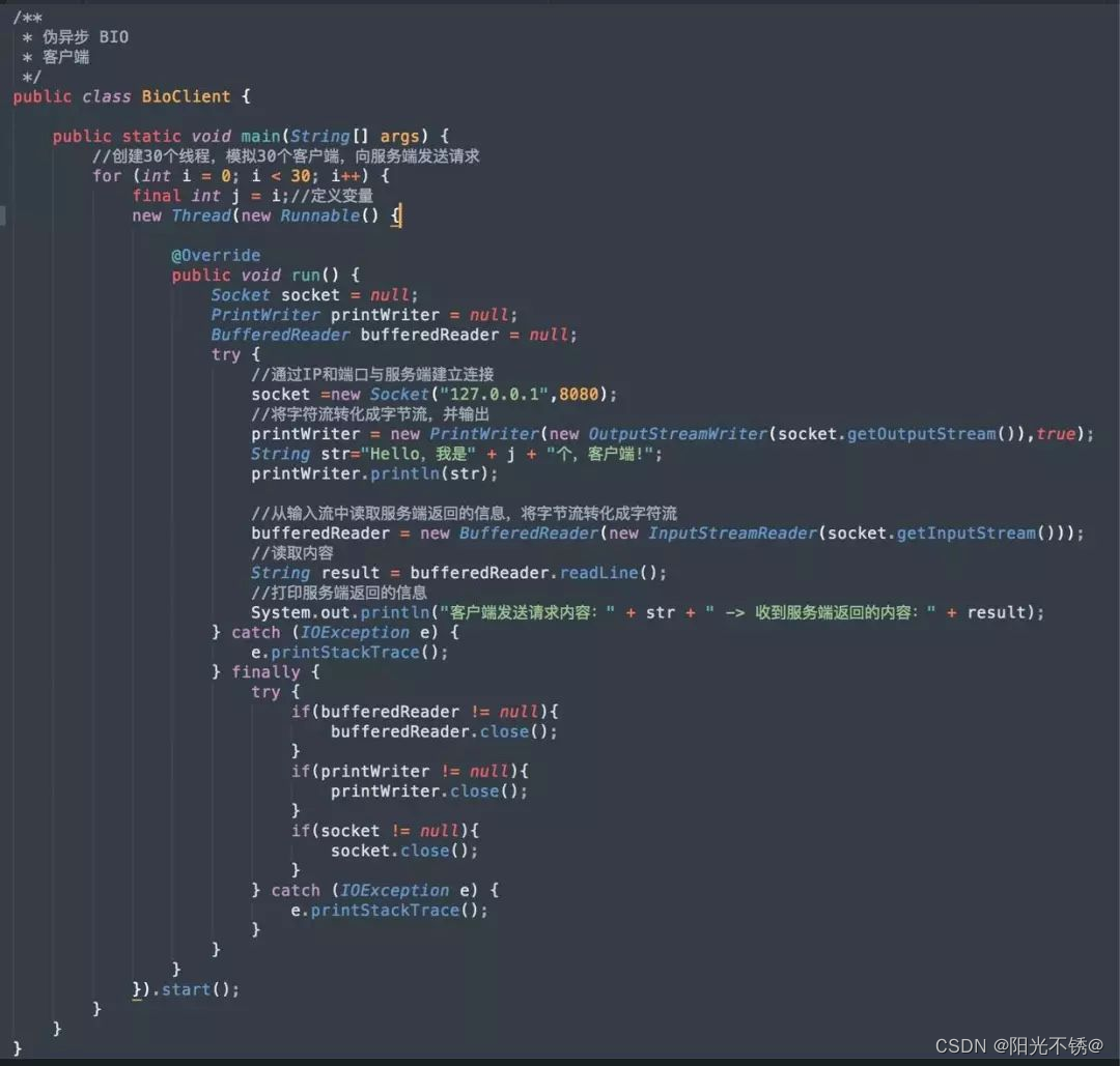 本例中测试的客户端数量是 30,服务端使用 java 线程池来处理任务,线程数量为 5 个,服务端不用为每个客户端都创建一个线程,由于线程池可以设置消息队列的大小和最大线程数,因此,它的资源占用是可控的,无论多少个客户端并发访问,都不会导致资源的耗尽和宕机。