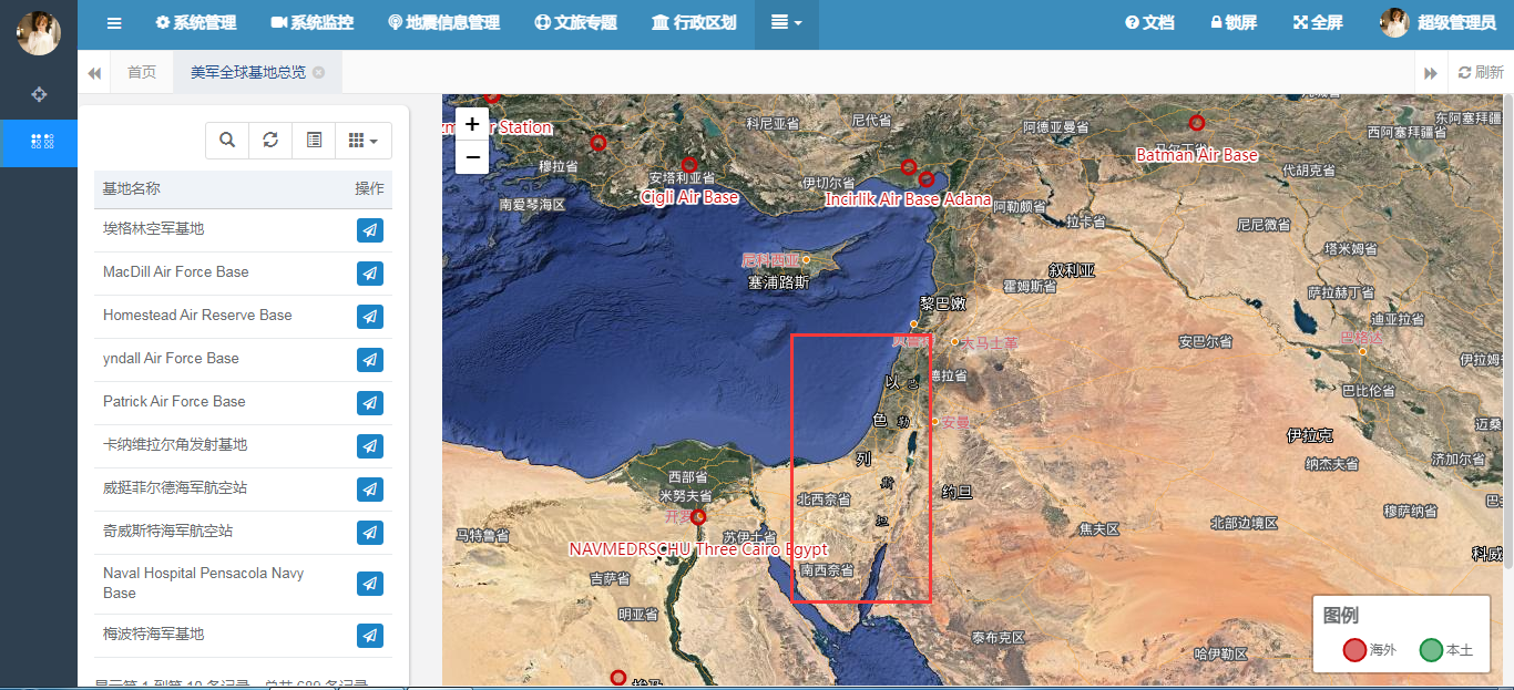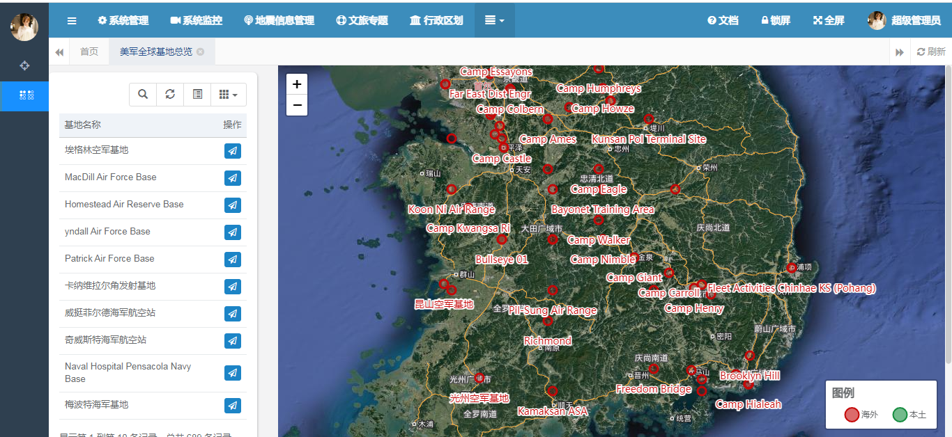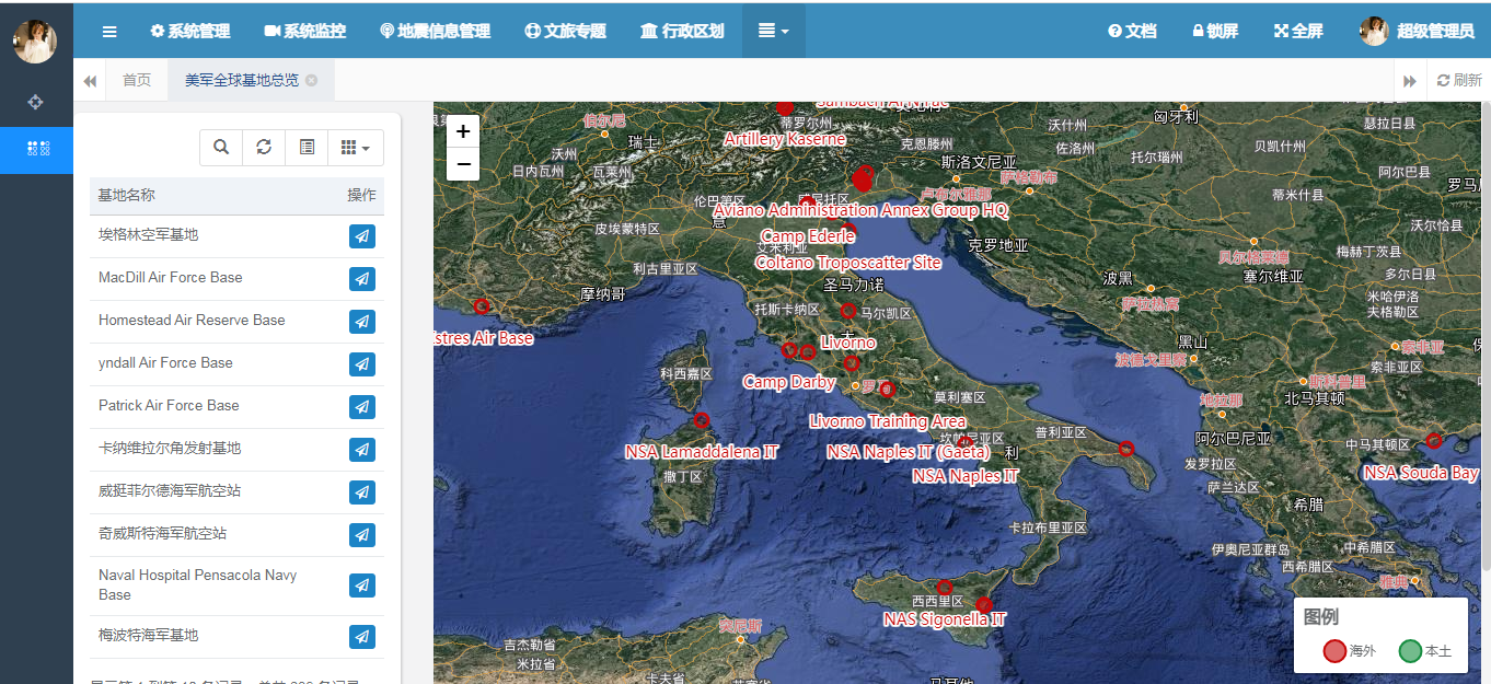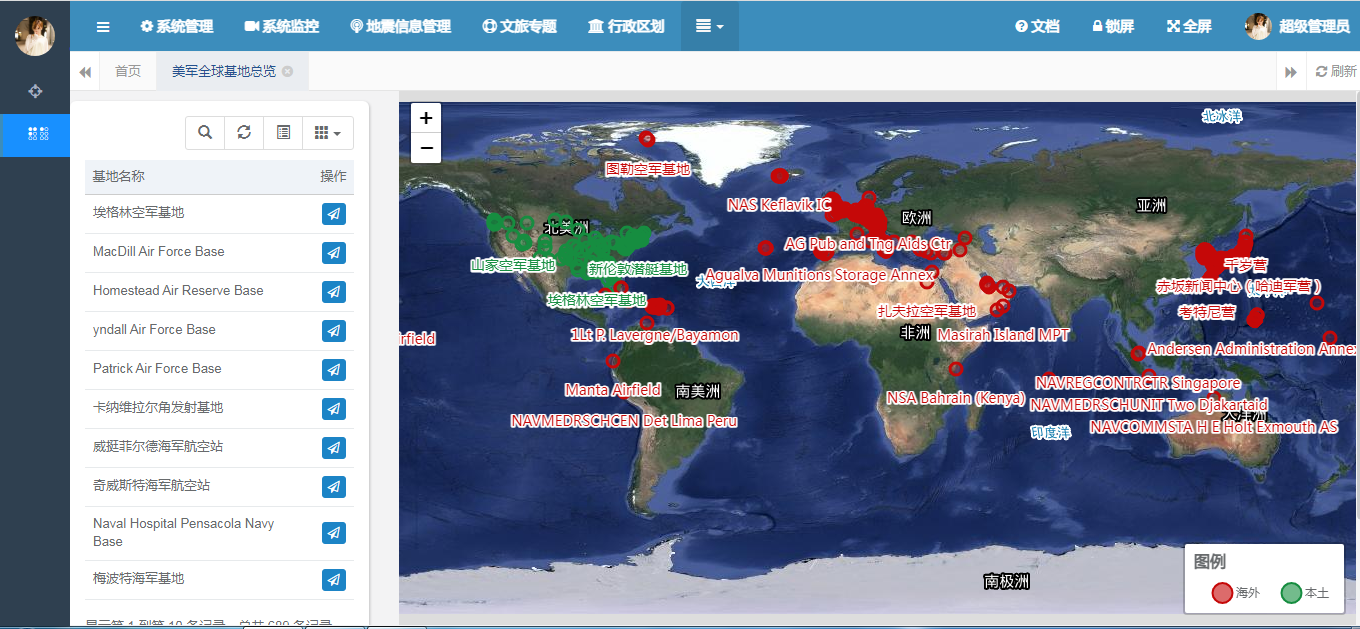 ar options = { url: prefix + "/list", modalName: "美军全球军事基地", columns: [ { field: 'id', title: '', visible: false }, { field: 'enName', title: '基地名称', formatter: function(value, row, index) { //return row.code + "/"+ row.name; return row.enName; } }, { title: '操作', align: 'center', formatter: function(value, row, index) { var actions = []; actions.push(' '); return actions.join(''); } }] }; $.table.init(options); 在界面中初始化表格的基本信息之后,我们还要将其全球的基地信息全部查询出来,然后在地图上进行展示。地图的展示包括两个部分,第一个部分是图例的展示,包括国内和海外基地两种类型。具体图例的展示如下: