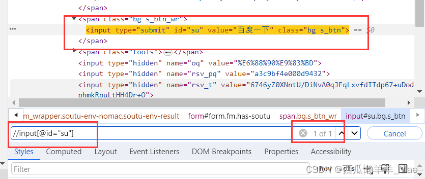 # 创建浏览器对象driver # 定位百度一下按钮,并点击 driver.find_element(By.CSS_SELECTOR, "input[value$='一下']").click() (12)、标签名 > 子标签[属性名$=值] + 兄弟标签名