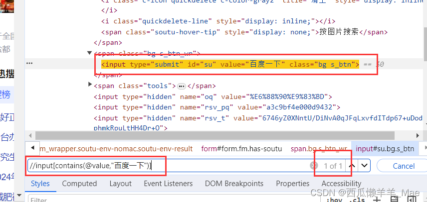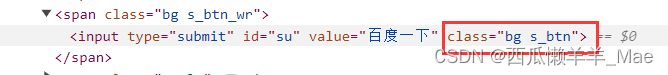 # 创建浏览器对象driver # 定位百度一下按钮,点击 driver.find_element(By.CSS_SELECTOR, "input[value*='百度']").click() (10)、标签名[属性名^=值]:以属性的开始值进行定位