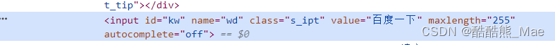 # 创建浏览器对象driver # 定位百度一下按钮,并点击 driver.find_element(By.CSS_SELECTOR, "input[value^='百度']").click() (11)、标签名[属性名$=值]:以属性的结束值进行定位