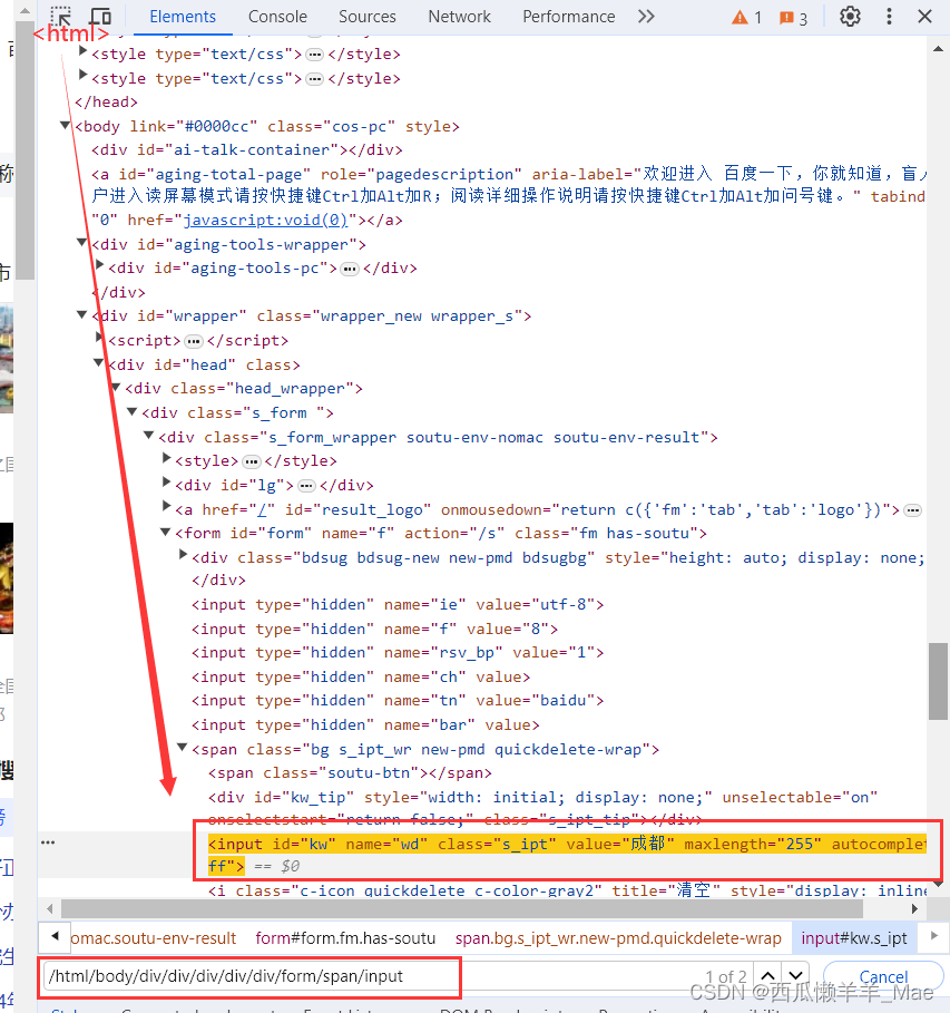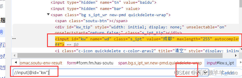 # 创建浏览器对象driver # 定位百度输入框,输入Python driver.find_element(By.CSS_SELECTOR, "[name='wd']").send_keys("python") (7)、[属性名1=值1][属性名2=值2]:以属性1的值1和属性2的值2进行定位