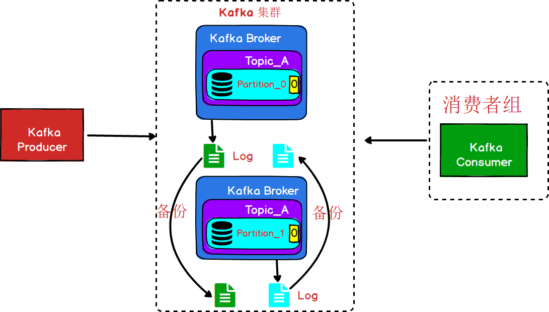 **Replica:**即副本,为实现数据备份的功能,保证集群中的某个节点发生故障时,该节点上的 Partition 数据不丢失,且 Kafka 仍然能够继续工作,为此Kafka提供了副本机制,一个 Topic 的每个 Partition 都有若干个副本,一个 Leader 副本和若干个 Follower 副本。