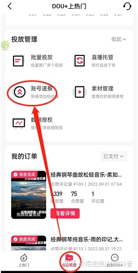 点击三条杠,点击更多功能,点击上热门,点击投放管理,点击展开,点击账号速推,记得切换为高级版。
