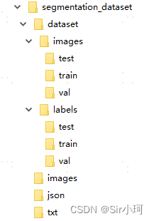 import shutil import random import os # 检查文件夹是否存在 def mkdir(path): if not os.path.exists(path): os.makedirs(path) def split(image_dir, txt_dir, save_dir): # 创建文件夹 mkdir(save_dir) images_dir = os.path.join(save_dir, 'images') labels_dir = os.path.join(save_dir, 'labels') img_train_path = os.path.join(images_dir, 'train') img_test_path = os.path.join(images_dir, 'test') img_val_path = os.path.join(images_dir, 'val') label_train_path = os.path.join(labels_dir, 'train') label_test_path = os.path.join(labels_dir, 'test') label_val_path = os.path.join(labels_dir, 'val') mkdir(images_dir) mkdir(labels_dir) mkdir(img_train_path) mkdir(img_test_path) mkdir(img_val_path) mkdir(label_train_path) mkdir(label_test_path) mkdir(label_val_path) # 数据集划分比例,训练集75%,验证集15%,测试集15%,按需修改 train_percent = 0.8 val_percent = 0.1 test_percent = 0.1 total_txt = os.listdir(txt_dir) num_txt = len(total_txt) list_all_txt = range(num_txt) # 范围 range(0, num) num_train = int(num_txt * train_percent) num_val = int(num_txt * val_percent) num_test = num_txt - num_train - num_val train = random.sample(list_all_txt, num_train) # 在全部数据集中取出train val_test = [i for i in list_all_txt if not i in train] # 再从val_test取出num_val个元素,val_test剩下的元素就是test val = random.sample(val_test, num_val) print("训练集数目:{}, 验证集数目:{},测试集数目:{}".format(len(train), len(val), len(val_test) - len(val))) for i in list_all_txt: name = total_txt[i][:-4] srcImage = os.path.join(image_dir, name + '.jpg') srcLabel = os.path.join(txt_dir, name + '.txt') if i in train: dst_train_Image = os.path.join(img_train_path, name + '.jpg') dst_train_Label = os.path.join(label_train_path, name + '.txt') shutil.copyfile(srcImage, dst_train_Image) shutil.copyfile(srcLabel, dst_train_Label) elif i in val: dst_val_Image = os.path.join(img_val_path, name + '.jpg') dst_val_Label = os.path.join(label_val_path, name + '.txt') shutil.copyfile(srcImage, dst_val_Image) shutil.copyfile(srcLabel, dst_val_Label) else: dst_test_Image = os.path.join(img_test_path, name + '.jpg') dst_test_Label = os.path.join(label_test_path, name + '.txt') shutil.copyfile(srcImage, dst_test_Image) shutil.copyfile(srcLabel, dst_test_Label) if __name__ == '__main__': image_dir = 'E:/segmentation_dataset/images' txt_dir = 'E:/segmentation_dataset/txt' save_dir = 'E:/segmentation_dataset/dataset' split(image_dir, txt_dir, save_dir) 运行完后得到如下文件: