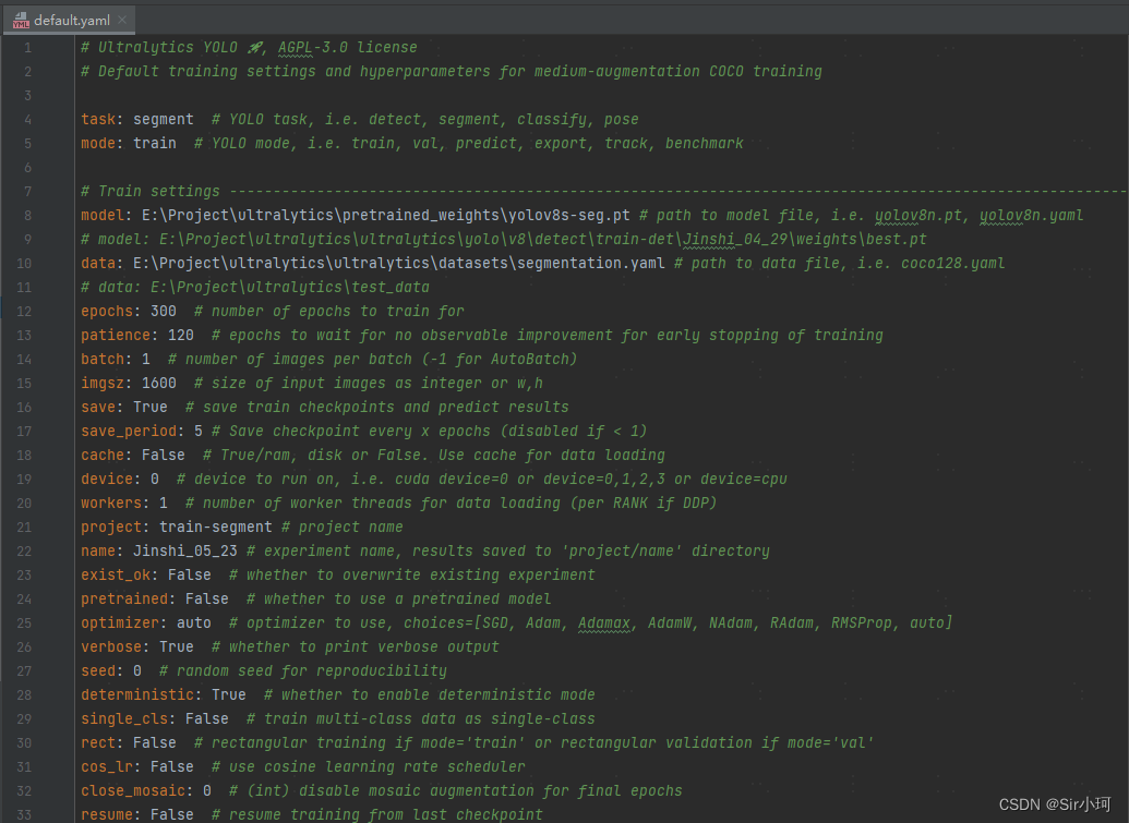 train: E:\segmentation_dataset\dataset\images\train # train images (relative to 'path') 128 images val: E:\segmentation_dataset\dataset\images\val # val images (relative to 'path') 128 images test: E:\segmentation_dataset\dataset\images\test # test images (optional) # Classes names: 0: material 1: inner_material 2: hole 配置参数如下图所示: