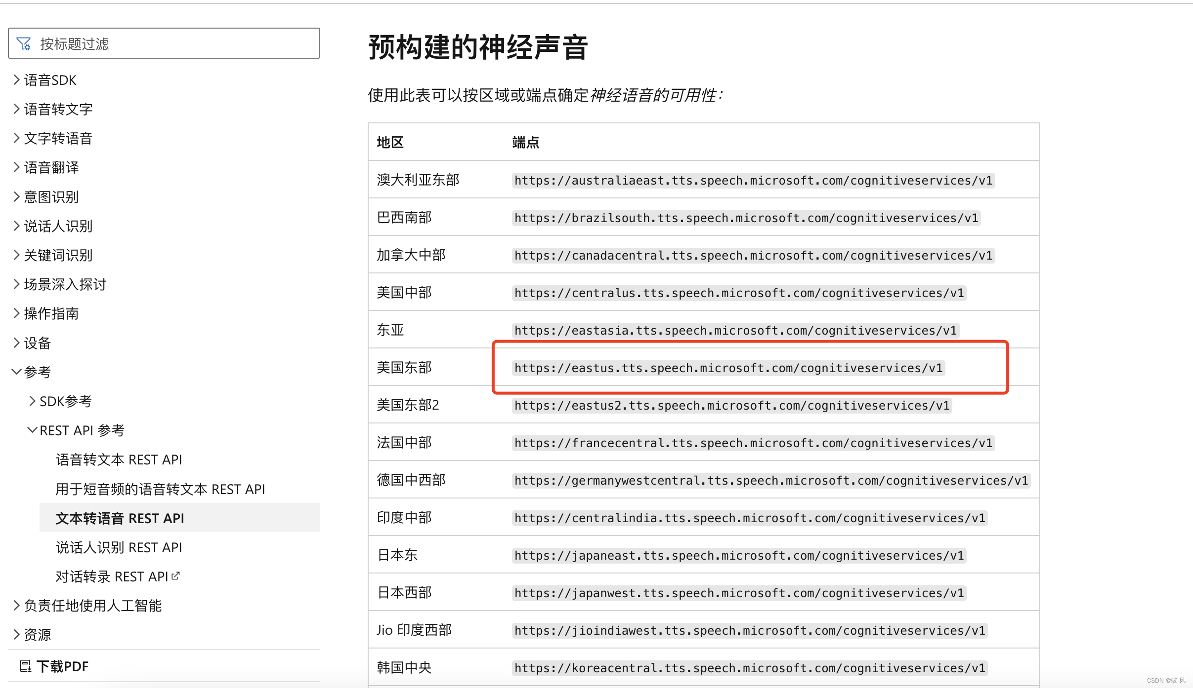 package com.daoversal.util; public class TtsConst { /** * 音频合成类型(亲测这种效果最佳,其他的你自己去试试) * 里面有很多类型,可以去里面找自己需要的 * https://learn.microsoft.com/en-us/azure/ai-services/speech-service/rest-text-to-speech?tabs=streaming */ public static final String AUDIO_24KHZ_48KBITRATE_MONO_MP3 = "audio-24khz-48kbitrate-mono-mp3"; /** * 授权url 获取密钥页面 终结点 里面的地址,我们使用这个获取token */ public static final String ACCESS_TOKEN_URI = "token获取地址"; /** * api key */ public static final String API_KEY = "自己的密钥"; /** * tts服务url,这里一定要根据自己分配的地区找相应的地址才行 */ public static final String TTS_SERVICE_URI = "https://eastus.tts.speech.microsoft.com/cognitiveservices/v1/"; } 下面参数给大家讲一下: