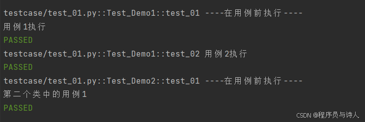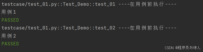 @pytest.fixture() def set(): print("----在用例前执行----") @pytest.mark.usefixtures('set') class Test_Demo(): def test_01(self): print('用例1') def test_02(self): print('用例2') 看下结果: