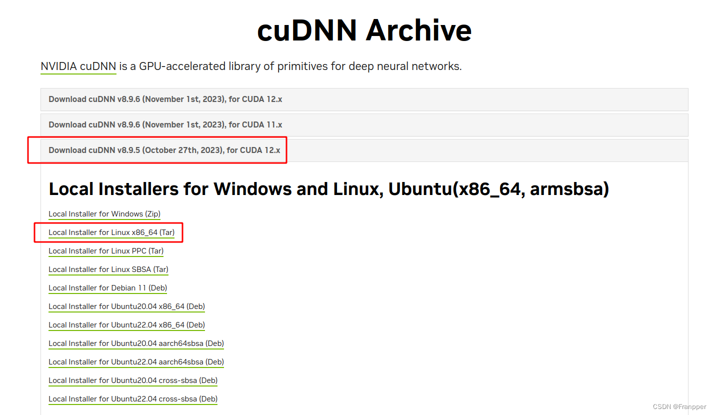 由于Franpper之前安装了12.0版本的CUDA,所以这里选择cuDNN v8.9.5进行安装。