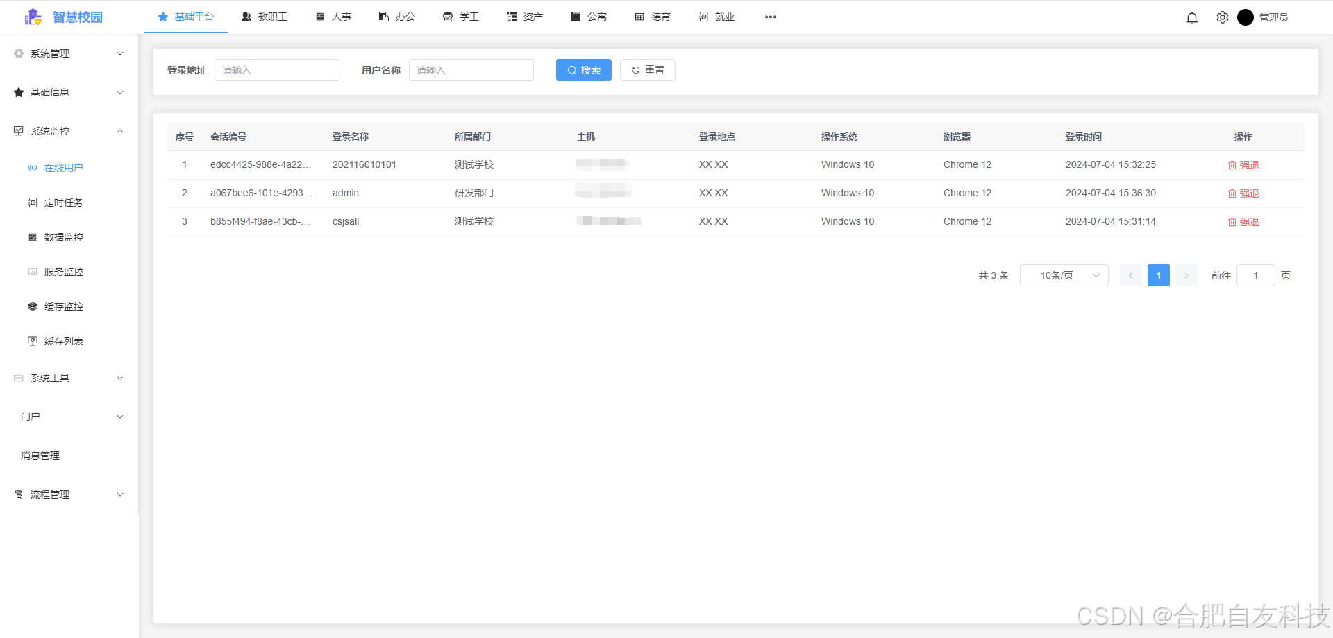 在安全保护层面上,这项功能犹如一个全天候的数字哨兵,对所有登录活动保持着高度警觉,能够精准识别出任何偏离常规的行为模式或是隐藏的网络威胁,为校园的数字疆域架设了一道坚实的安全屏障。一旦系统捕捉到异常迹象,立即触发预警机制,允许管理人员迅速响应,采取必要的干预措施,确保所有数据信息的严密保护及平台运行的平稳无虞,为校园网络环境的健康与安全保驾护航。可对可疑登录进行强制退出操作。