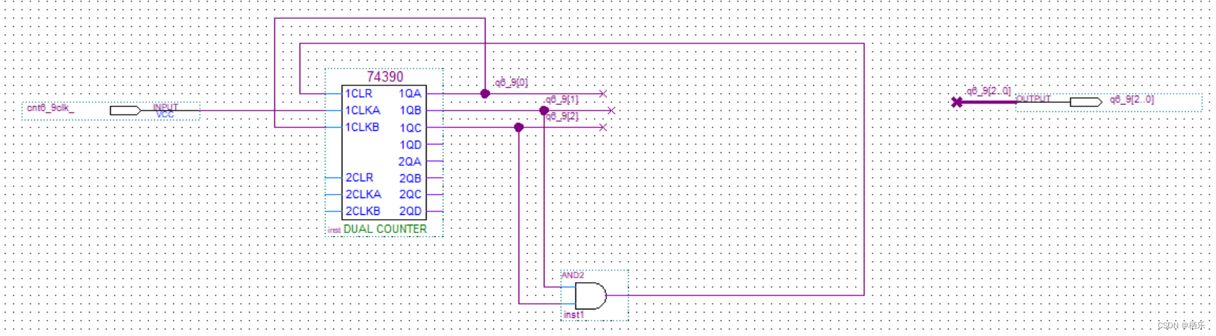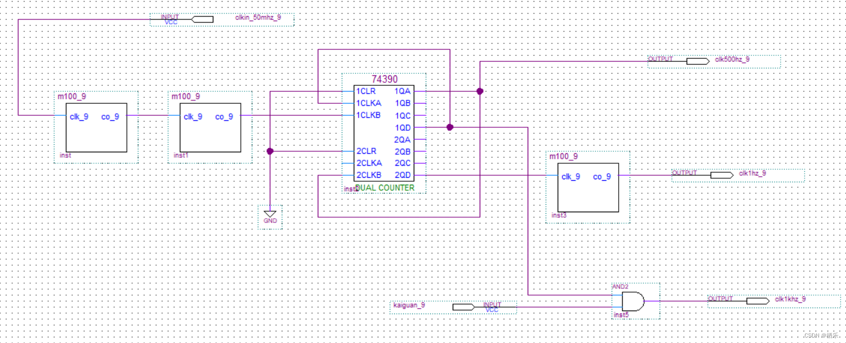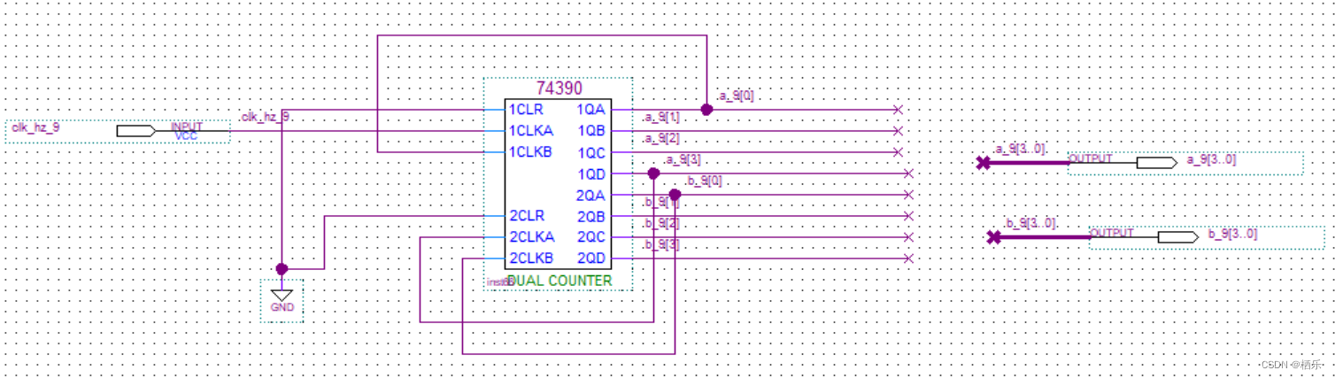 可使用74390设计实现00-99的模100计数。输入1Hz时钟信号,输出shi[3..0]和ge[3..0]。