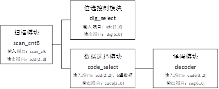 该模块主要功能是通过数码管的动态扫描实现6位数码管显示计数结果,本模块由扫描模块scan_cnt6,位选控制模块dig_select,数据选择控制模块code_select以及译码模块decoder构成,如图9-5所示。