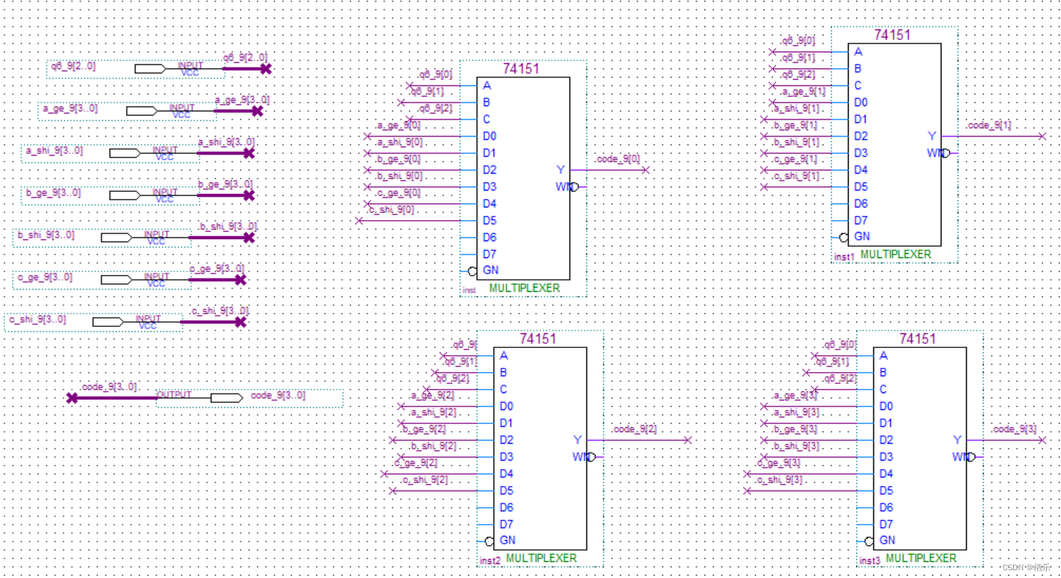 - 数据选择模块(code_select):输入6组数据,每组数据4bit,本模块完成在地址端的控制下从6组数据当中选择1组输出。