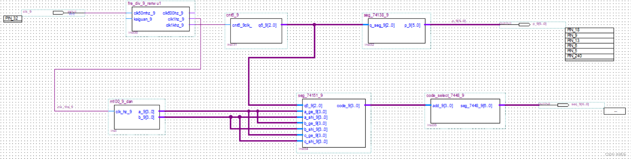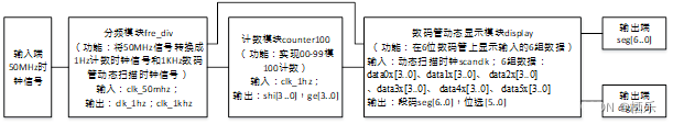 由分频模块fre_div,计数器模块counter100,动态显示模块diaplay构成。分频模块fre_div将可将实验平台晶体振荡器提供的50MHz时钟信号分频,输出500Hz,1KHz及 1Hz三种信号备用,conter100模块实现模100计数功能,display模块为数码管动态显示模块,实现计数数字在6位数码管上的动态显示。
