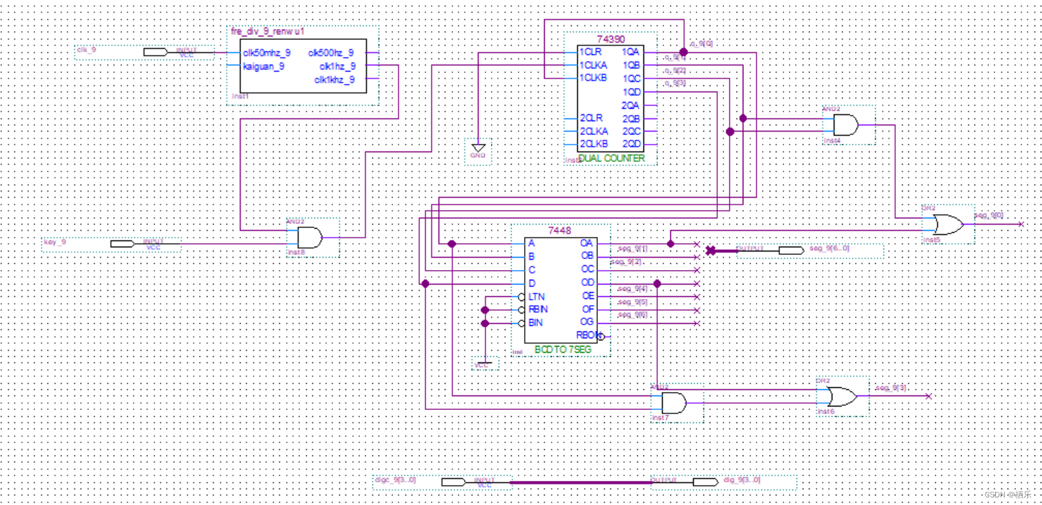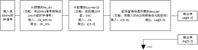 - Top_level设计:根据任务要求,需要一个秒信号产生模块,一个模10的计数模块以及一个译码显示模块:秒信号产生模块将开发板上的50MHz信号分频为1Hz信号,用作模10计数模块的时钟;模10电路完成0000-1001的计数,计数结果送译码模块;译码模块将4位BCD码转化为7段数码管段码。以上模块就是我们在之前的实验中已经设计过的:fre_div、cnt10、decoder。