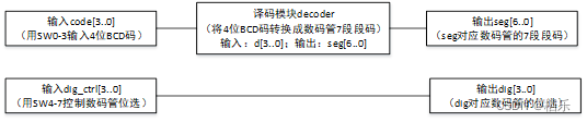 - 基本任务1:利用FPGA硬件平台上的4位数码管做静态显示,用SW3-0输入BCD码,用SW7-4控制数码管位选;