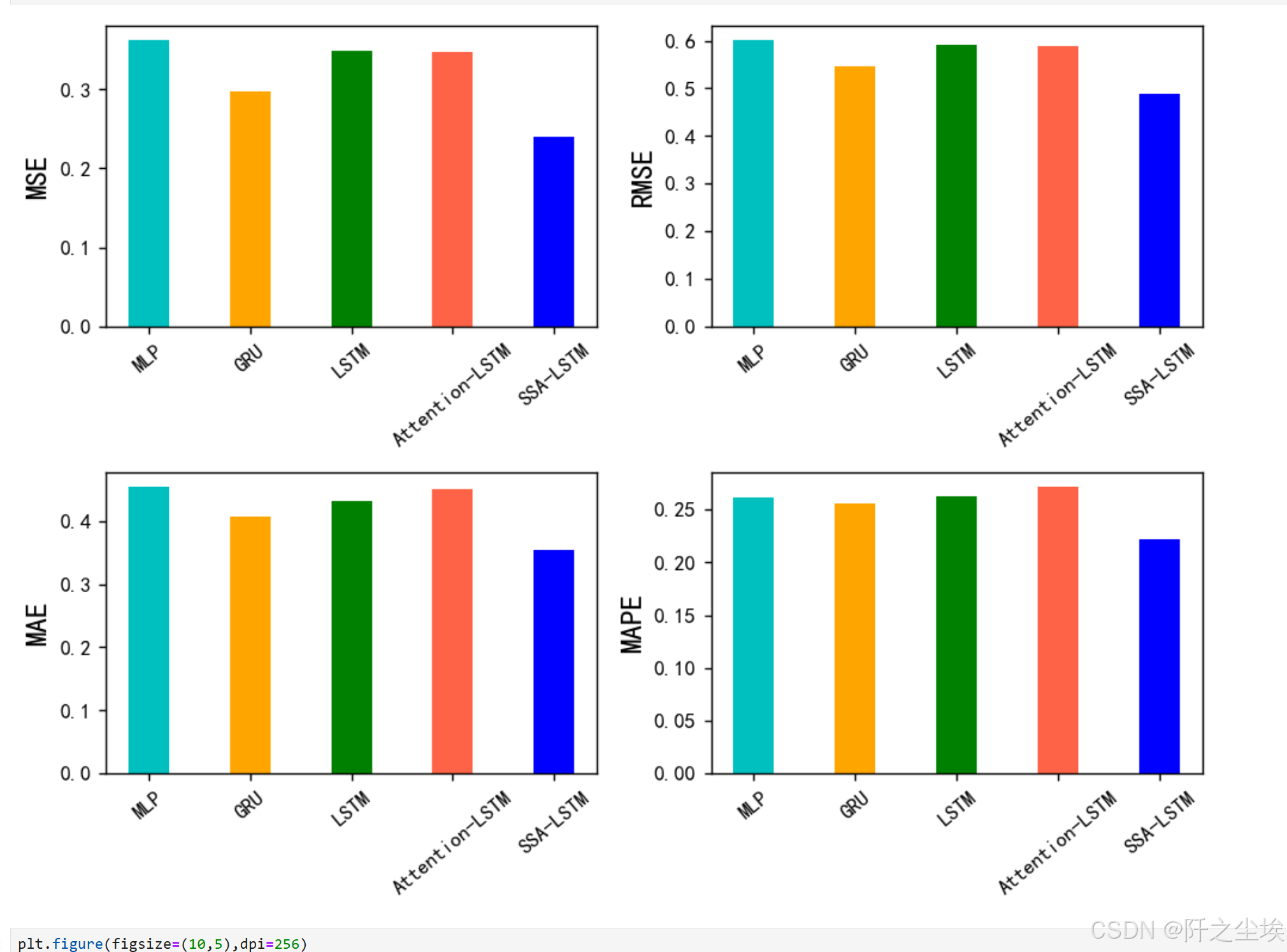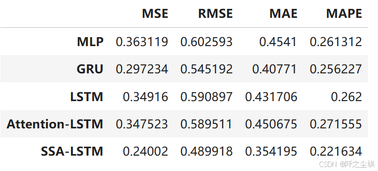 可以清楚地看见,SSA-lstm的效果最好,其次是GRU,然后是LSTM和attention-lstm。