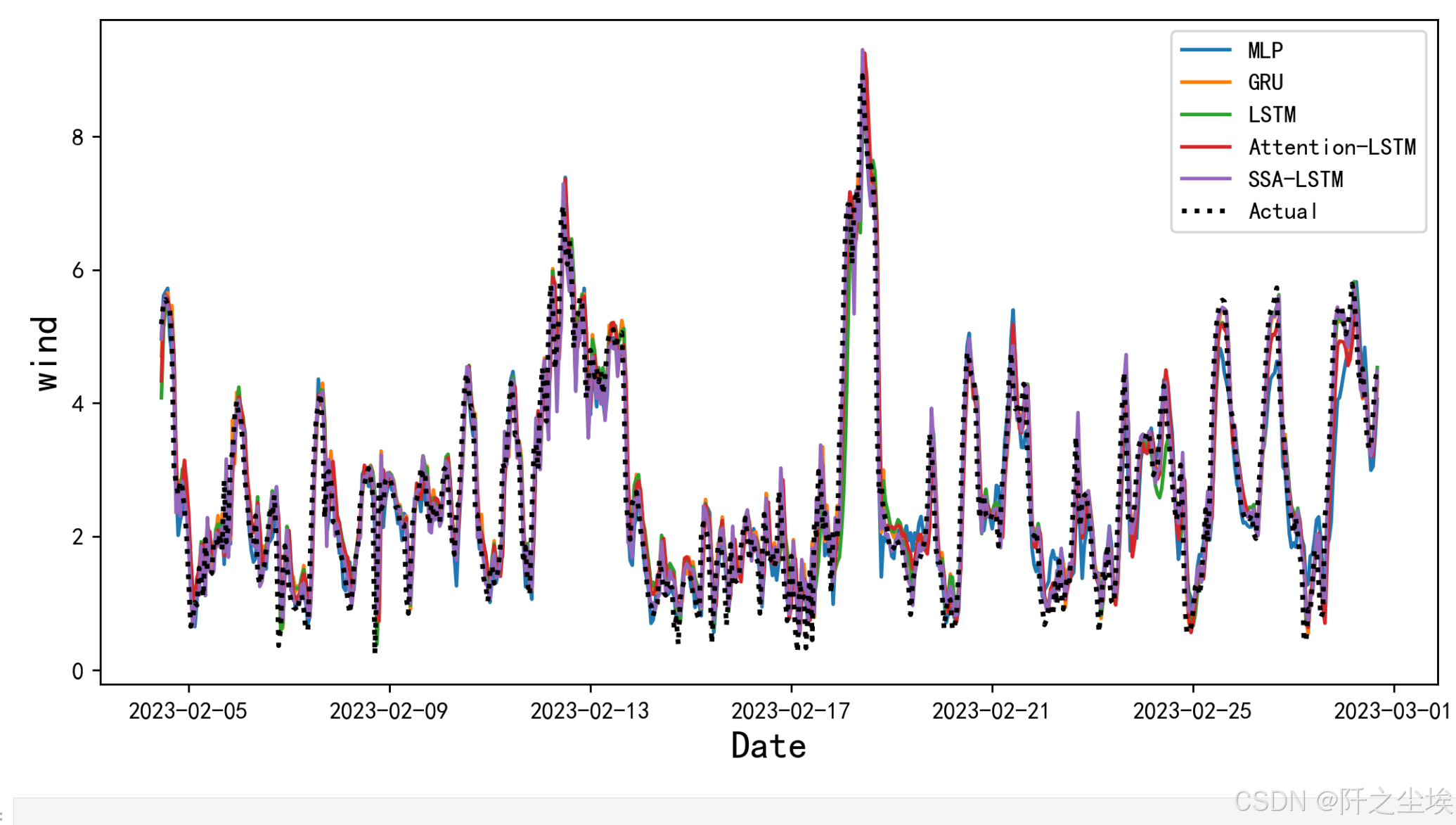plt.figure(figsize=(10,5),dpi=256) for i,col in enumerate(df_preds_all[['MLP','GRU','LSTM','Attention-LSTM','SSA-LSTM']].columns): plt.plot(data0.index[-test_size-1:],df_preds_all[col],label=col) # ,color=colors[i] plt.plot(data0.index[-test_size-1:],y_test.reshape(-1,),label='Actual',color='k',linestyle=':',lw=2) plt.legend() plt.ylabel('wind',fontsize=16) plt.xlabel('Date',fontsize=16) #plt.savefig('点估计线对比.jpg',dpi=256) plt.show()
