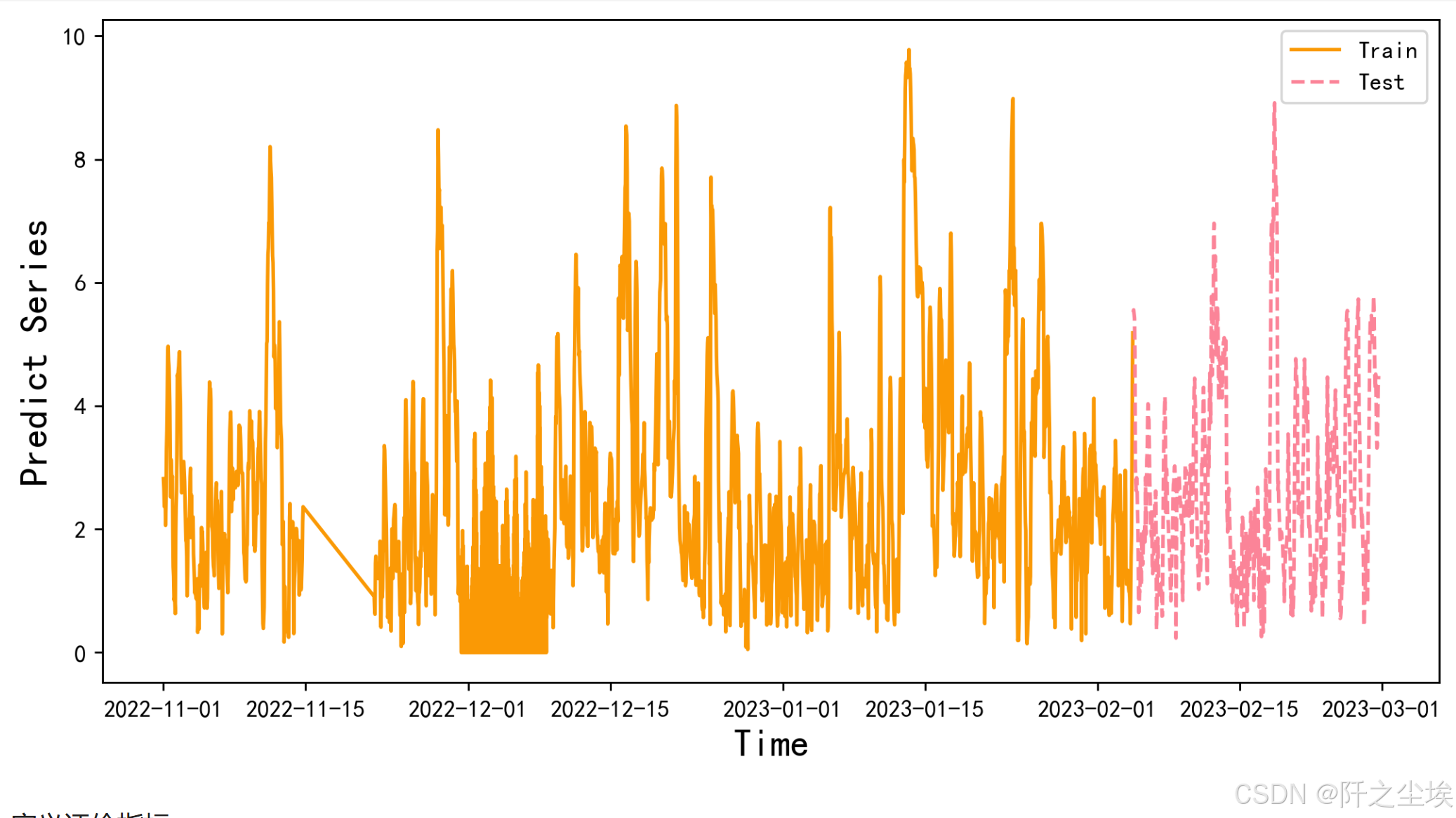 y_test = y_scaler.inverse_transform(y_test.reshape(-1,1)) test_size=int(len(data)*(1-train_ratio)) plt.figure(figsize=(10,5),dpi=256) plt.plot(data0.index[:-test_size],data0.iloc[:,-1].iloc[:-test_size],label='Train',color='#FA9905') plt.plot(data0.index[-test_size:],data0.iloc[:,-1].iloc[-(test_size):],label='Test',color='#FB8498',linestyle='dashed') plt.legend() plt.ylabel('Predict Series',fontsize=16) plt.xlabel('Time',fontsize=16) plt.show()