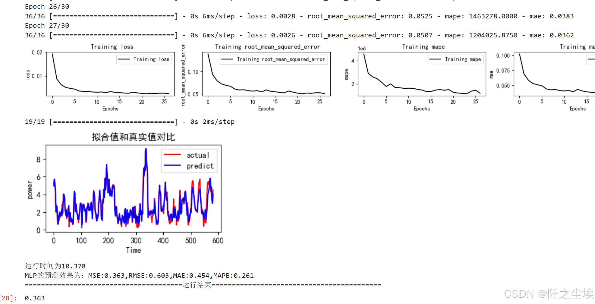 def plot_loss(hist,imfname=''): plt.subplots(1,4,figsize=(16,2)) for i,key in enumerate(hist.history.keys()): n=int(str('14')+str(i+1)) plt.subplot(n) plt.plot(hist.history[key], 'k', label=f'Training {key}') plt.title(f'{imfname} Training {key}') plt.xlabel('Epochs') plt.ylabel(key) plt.legend() plt.tight_layout() plt.show() def plot_fit(y_test, y_pred): plt.figure(figsize=(4,2)) plt.plot(y_test, color="red", label="actual") plt.plot(y_pred, color="blue", label="predict") plt.title(f"拟合值和真实值对比") plt.xlabel("Time") plt.ylabel('power') plt.legend() plt.show() 可能有的小伙伴觉得看不懂了,没关系,我都是高度的封装,不需要知道每个函数里面的细节,大概知道他们是做什么的就行。因为下面要把他们全部打包为训练函数,改一下参数就可以使用不同的模型,很方便,