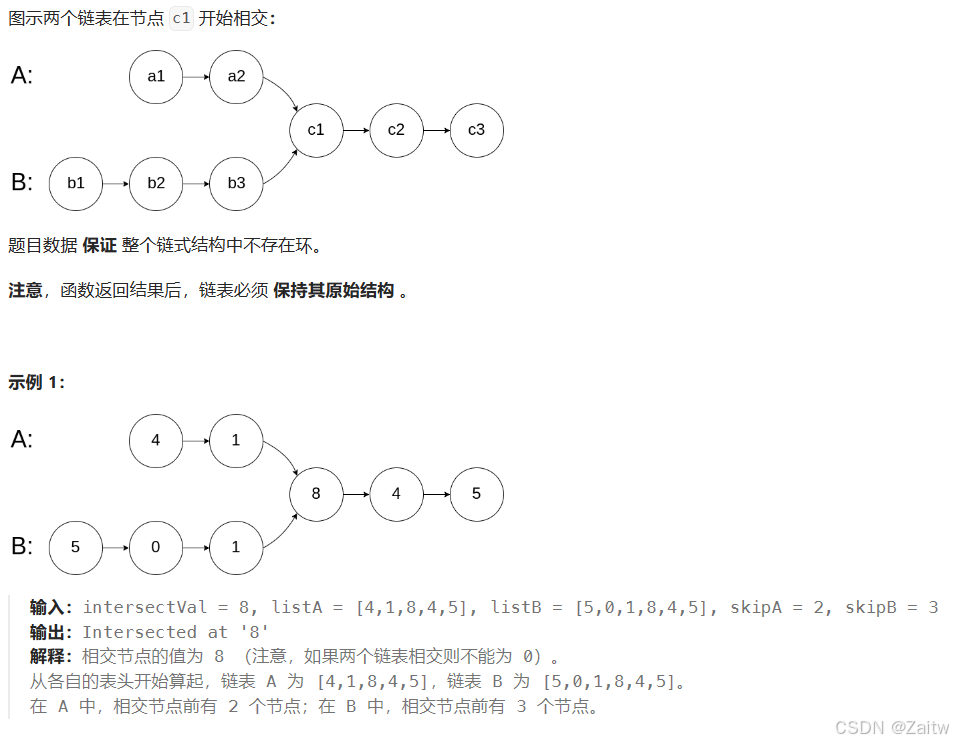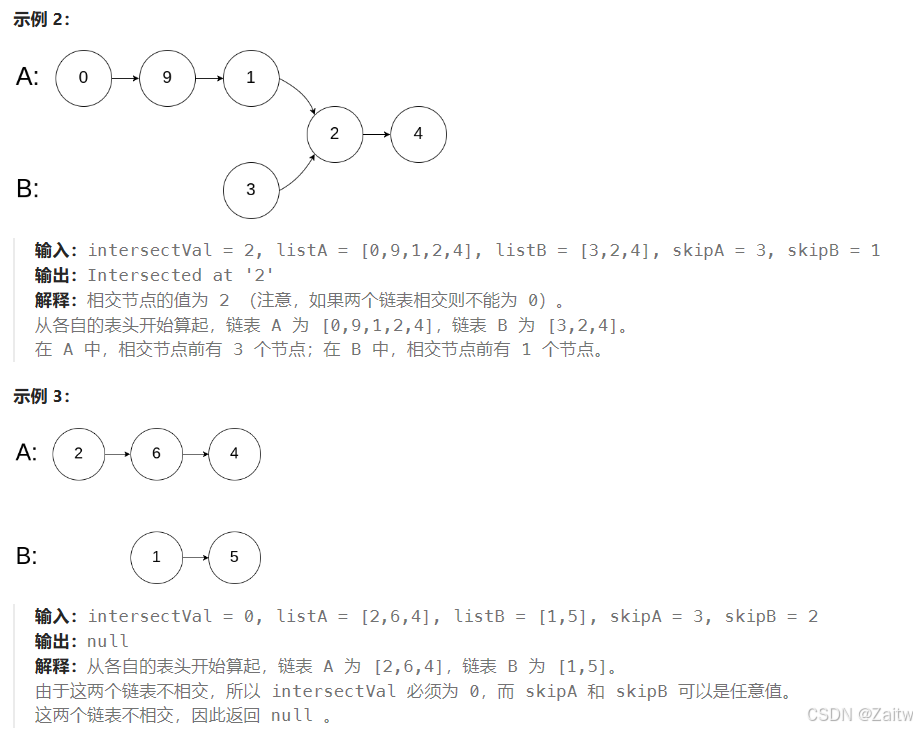 public ListNode getIntersectionNode2(ListNode headA, ListNode headB) { ListNode A =headA; ListNode B=headB; while(A!=B){//A==B有两种情况,AB链表相交 A=B=null if(A==null) A=headB; else A=A.next; if(B==null) B=headA; else B=B.next; } return A; }