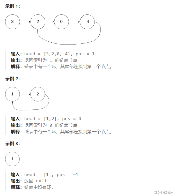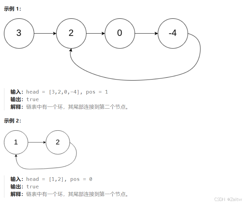 为了表示给定链表中的环,我们使用整数 pos 来表示链表尾连接到链表中的位置(索引从 0 开始)。 如果 pos 是 -1,则在该链表中没有环。注意,pos 仅仅是用于标识环的情况,并不会作为参数传递到函数中。