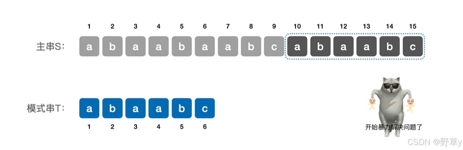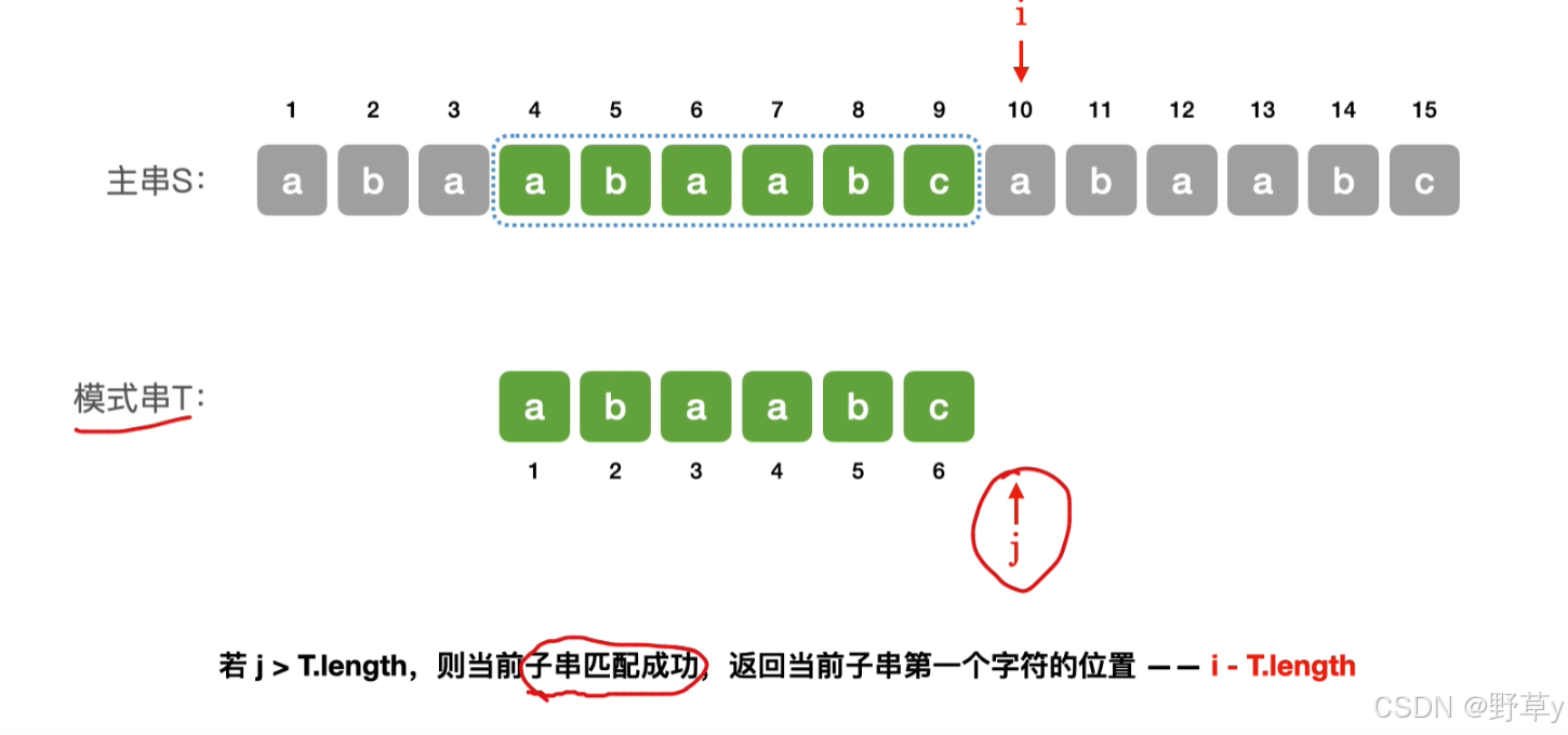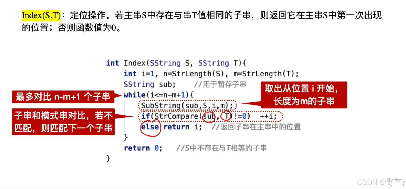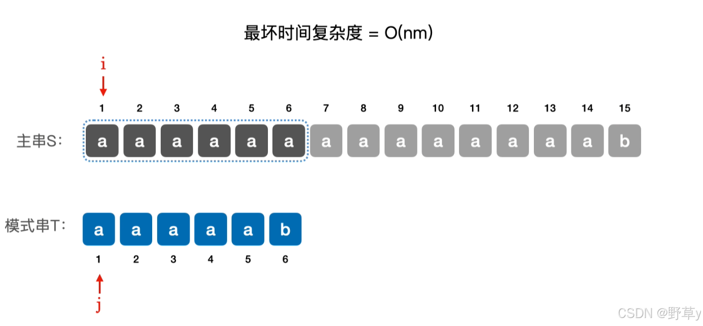 // 函数Index:在主串S中查找子串T的位置 // 返回值:如果找到子串,返回子串在主串中的位置(从1开始计数) // 如果没有找到,返回0 int Index(SString S, SString T) { int i = 1, j = 1; while (i <= S.length && j <= T.length) { if (S.ch[i] == T.ch[j]) { ++i; ++j; // 如果当前字符匹配,继续比较下一个字符 } else { i = i - j + 2; // i回退到下一个可能的子串的起始位置 j = 1; // j重置为1,重新开始匹配 } } if (j > T.length) return i - T.length; // 如果找到子串,返回子串在主串中的位置 else return 0; // 如果没有找到子串,返回0 } 设主串长度为n,模式串长度为m,则最坏时间复杂度=O(nm)