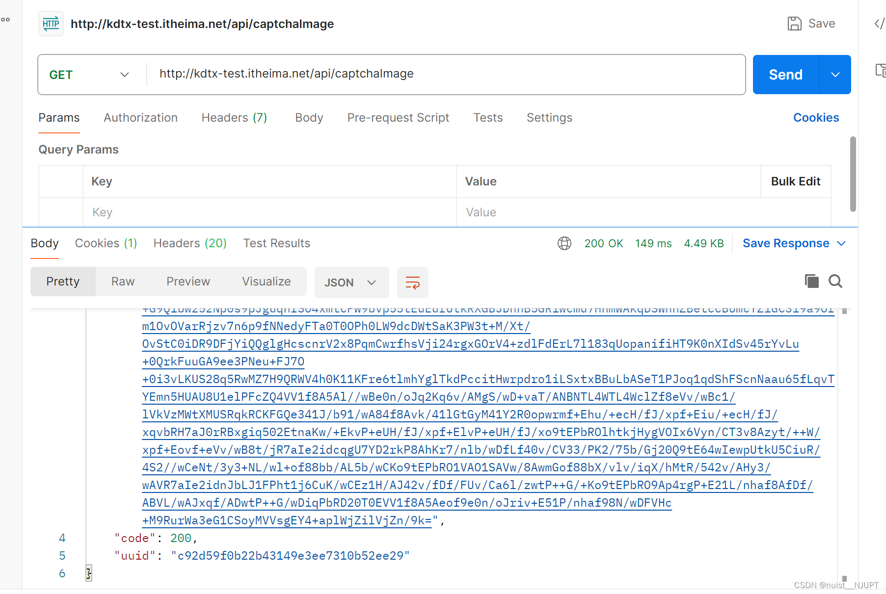 # 获取图片验证码 # 1.导包 import requests # 2.发送请求 response = requests.get(url="http://kdtx-test.itheima.net/api/captchaImage") # 3.查看响应 print(response.status_code) print(response.text) 第二步:根据获取的验证码uuid发送登录请求