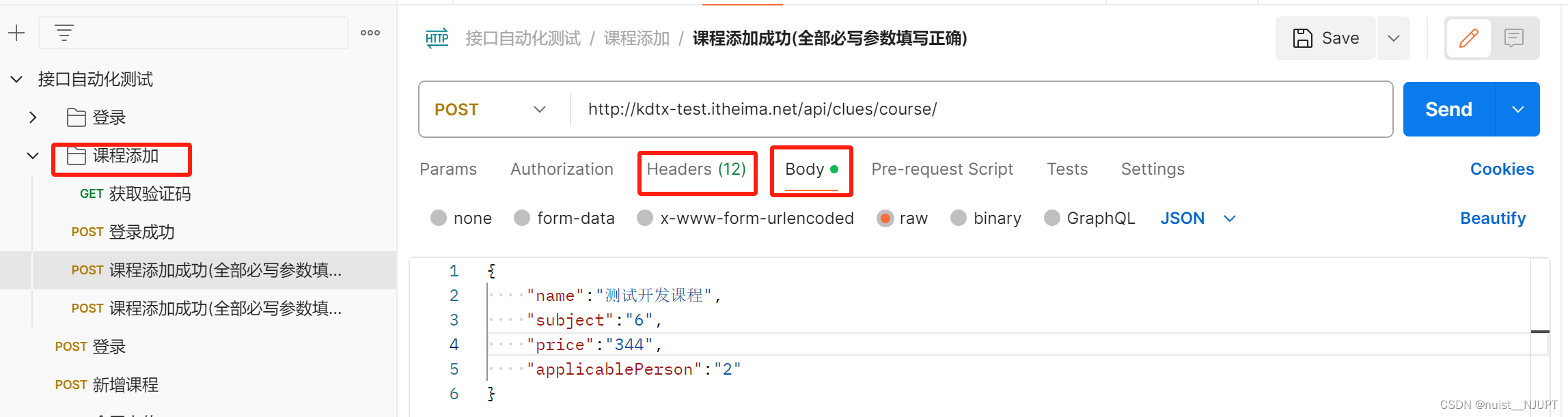 由于增删改查的思路都是一致的,设置请求url,请求头以及请求体即可完成测试,在一个课程添加文件夹下可以测试与管理多个用例。