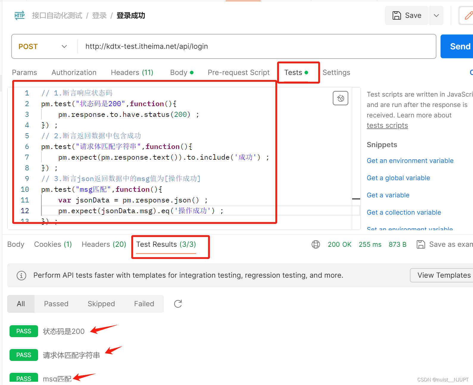 可以在postman中设置断言,Tests中断言函数,通过断言函数对响应结果进行断言。