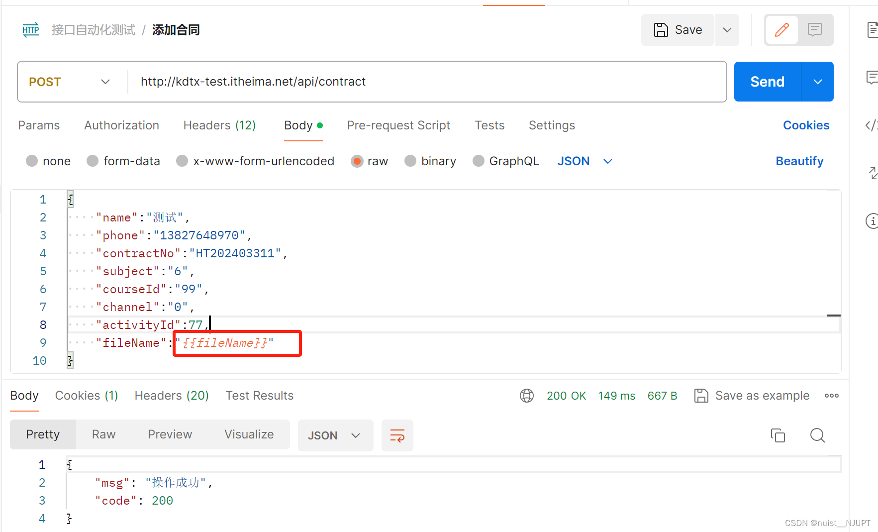 9.在添加合同接口中使用{{fileName}}引用合同上传接口中保存的环境变量。