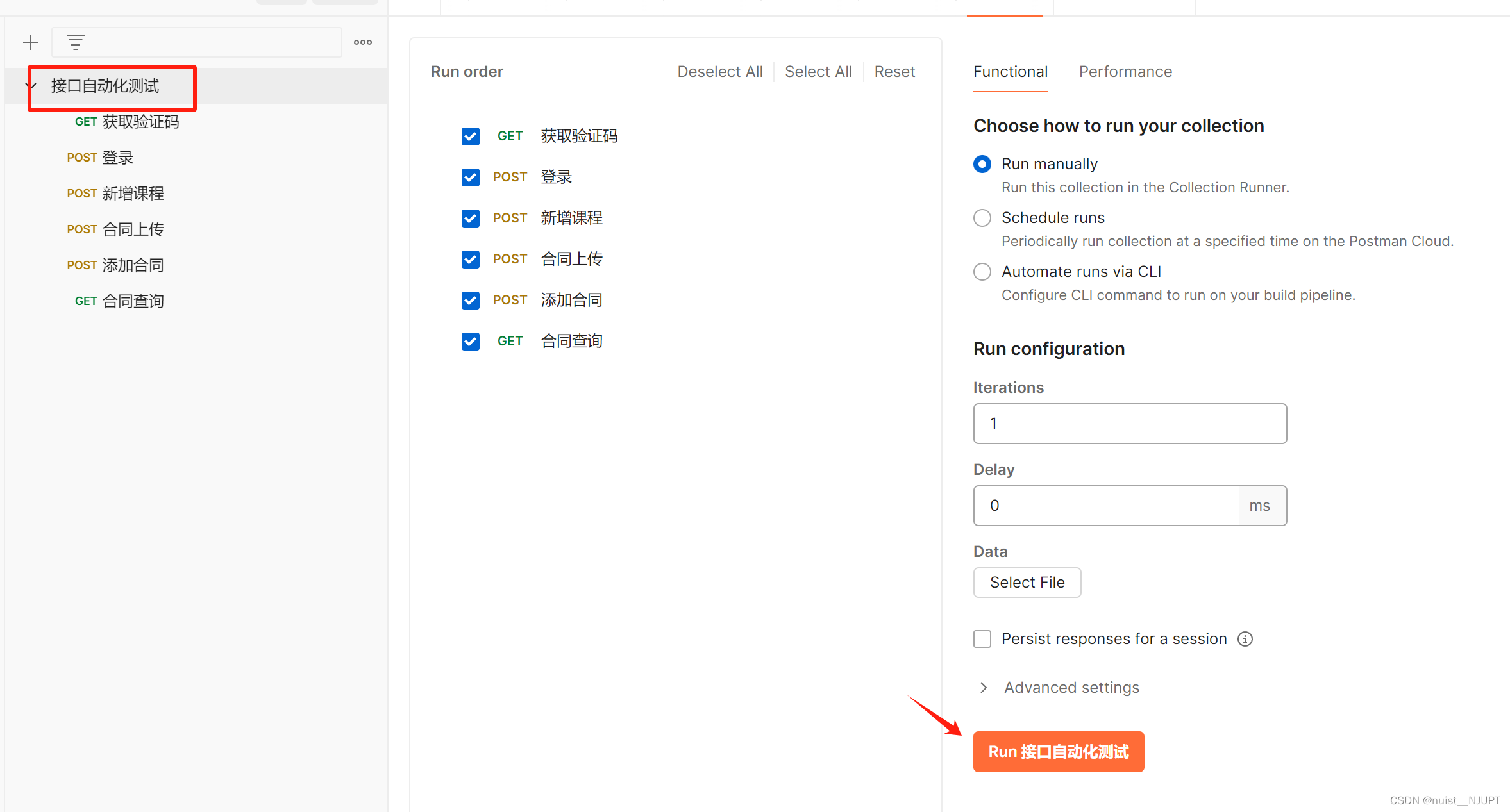 在接口自动化测试文件夹中选择run,然后点击如下箭头所示的Run自动化测试即可实现接口的批量执行。