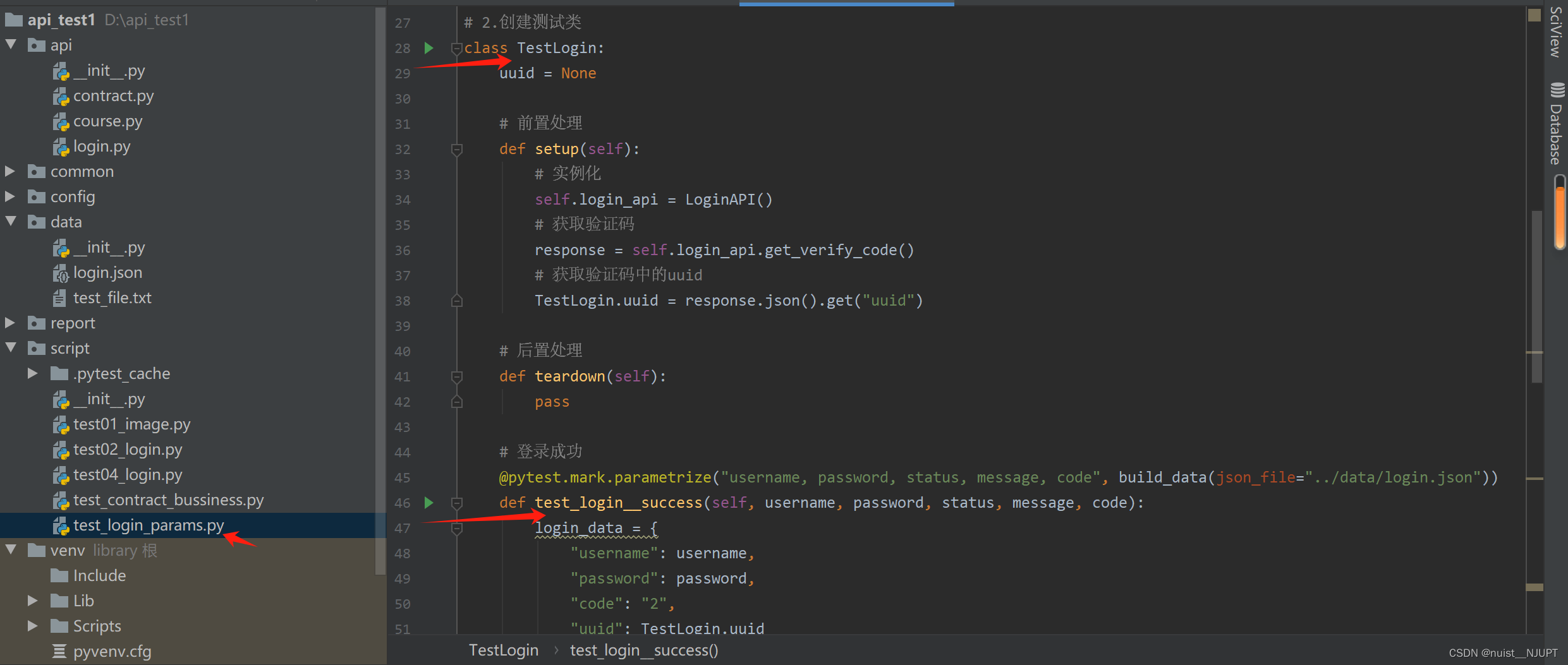 # 登录 # 1.导包 import requests # 2.发送请求 url = "http://kdtx-test.itheima.net/api/login" header_data = { "Content-Type": "application/json" } login_data = { "username": "admin", "password": "HM_2023_test", "code": "2", "uuid": "98648849e1214e67bd7c9d4af396ab69" } try: response = requests.post(url=url,headers=header_data,json=login_data) except Exception as e: print("异常:", e) finally: pass # 3.获取响应结果 print(response.status_code) print(response.json()) 上述的代码并没有合理的实现api的封装与调用,下面将登录过程封装到api包下的loginAPI类中,再后续的测试中直接实例化登录类,并调用相应的方法即可实现登录。
