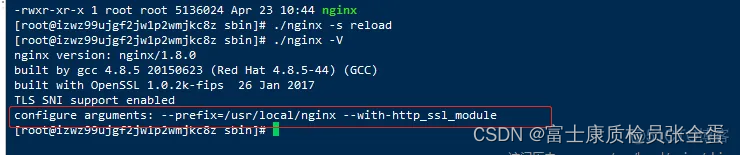 nginx 安装目录,下面有个 sbin 文件夹,来到 sbin 目录下执行 ./nginx -V命令,注意是大写的 V,小写的 v 只会展示 nginx 的版本号信息。执行完出现下图圈红的这些信息说明 ssl 模块已经安装过了。可以忽略下文的 ssl 模块安装的相关内容,直接看 nginx 配置的内容。