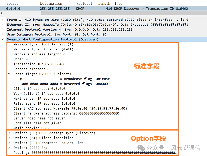 xid:客户端通过DHCP Discover报文发起一次IP地址请求时选择的随机数,相当于请求标识。用来标识一次IP地址请求过程。在一次请求中所有报文的Xid都是一样的。