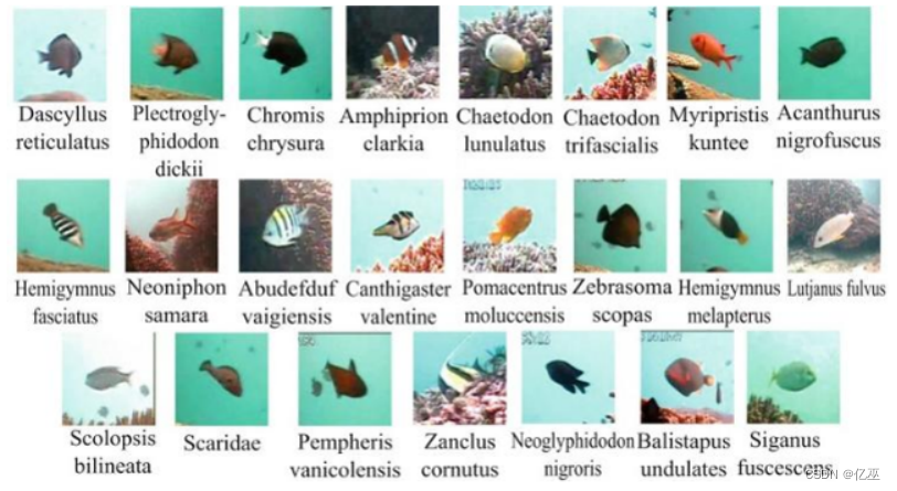 该数据集包括23类鱼种,共27370张鱼的图像,都是RGB彩色图像,该数据集的目标是通过训练一个模型,使其能够正确地识别海洋生物的种类。每张图像都有对应的标签,表示图像中生物种类。因此,该数据集是一个经典的监督学习问题,其中输入是图像,输出是对应的生物种类标签。