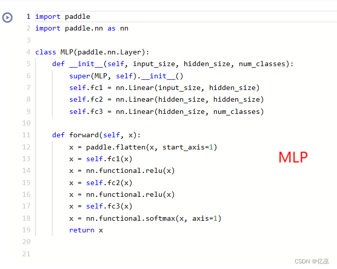 这个 MLP 架构包括两个带有 ReLU 激活的线性层,最后使用 softmax 激活进行多类别分类。