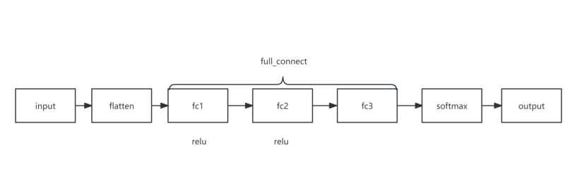 输入张量 x 沿第二个轴展平。将展平后的输入通过第一个线性层 (fc1)。应用 ReLU 激活函数。将结果通过第二个线性层 (fc2)。再次应用 ReLU 激活函数。将结果通过第三个线性层 (fc3)。最后,在轴 1 上应用 softmax 激活函数,获得输出概率。