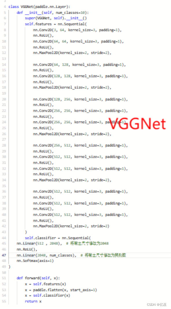 2. 深度和宽度:VGGNet以其深度和宽度的设计而闻名。它引入了不同层数和参数量的变体,其中最著名的是VGG16和VGG19。VGG16具有16个卷积层(包括13个卷积层和3个全连接层),VGG19更进一步,具有19个卷积层(包括16个卷积层和3个全连接层)。这种深度和宽度的设计使得VGGNet能够更好地捕捉图像中的细节和抽象特征。