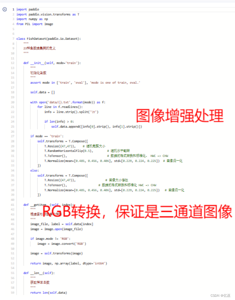 #导入必要的包 import zipfile import os import random import paddle import matplotlib.pyplot as plt from paddle.nn import MaxPool2D,Conv2D,BatchNorm from paddle.nn import Linear import sys import numpy as np from PIL import Image from PIL import ImageEnhance import paddle from multiprocessing import cpu_count import matplotlib.pyplot as plt import json #解压原始数据集,将fish_image.zip解压至data目录下 src_path="/home/aistudio/data/data14492/fish_image23.zip" target_path="/home/aistudio/data/fish_image" if(not os.path.isdir(target_path)): z = zipfile.ZipFile(src_path, 'r') z.extractall(path=target_path) z.close() #存放所有类别的信息 class_detail = [] data_root_path="/home/aistudio/data/fish_image/fish_image" #获取所有类别保存的文件夹名称 class_dirs = os.listdir(data_root_path) data_list_path="/home/aistudio/data/" TRAIN_LIST_PATH=data_list_path + "train.txt" EVAL_LIST_PATH=data_list_path + "eval.txt" #每次执行代码,首先清空train.txt和eval.txt with open(TRAIN_LIST_PATH, 'w') as f: pass with open(EVAL_LIST_PATH, 'w') as f: pass #总的图像数量 all_class_images = 0 #存放类别标签 class_label=0 #存储要写进test.txt和train.txt中的内容 trainer_list=[] eval_list=[] #读取每个类别,['fish_01', 'fish_02', 'fish_03'] for class_dir in class_dirs: #每个类别的信息 class_detail_list = {} eval_sum = 0 trainer_sum = 0 #统计每个类别有多少张图片 class_sum = 0 #获取类别路径 path = data_root_path + "/" + class_dir # 获取所有图片 img_paths = os.listdir(path) for img_path in img_paths: # 遍历文件夹下的每个图片 name_path = path + '/' + img_path # 每张图片的路径 if class_sum % 10 == 0: # 每10张图片取一个做验证数据 eval_sum += 1 # test_sum为测试数据的数目 eval_list.append(name_path + "\t%d" % class_label + "\n") else: trainer_sum += 1 trainer_list.append(name_path + "\t%d" % class_label + "\n")#trainer_sum测试数据的数目 class_sum += 1 #每类图片的数目 all_class_images += 1 #所有类图片的数目 class_label += 1 # 说明的json文件的class_detail数据 class_detail_list['class_name'] = class_dir #类别名称,如jiangwen class_detail_list['class_label'] = class_label #类别标签 class_detail_list['class_eval_images'] = eval_sum #该类数据的测试集数目 class_detail_list['class_trainer_images'] = trainer_sum #该类数据的训练集数目 class_detail.append(class_detail_list) random.shuffle(eval_list) with open(data_list_path + "eval.txt", 'a') as f: for eval_image in eval_list: f.write(eval_image) random.shuffle(trainer_list) with open(data_list_path + "train.txt", 'a') as f2: for train_image in trainer_list: f2.write(train_image) # 说明的json文件信息 readjson = {} readjson['all_class_name'] = data_root_path #文件父目录 readjson['all_class_sum'] = class_sum readjson['all_class_images'] = all_class_images readjson['class_detail'] = class_detail jsons = json.dumps(readjson, sort_keys=True, indent=4, separators=(',', ': ')) with open(data_list_path + "readme.json",'w') as f: f.write(jsons) print ('生成数据列表完成!') import paddle import paddle.vision.transforms as T import numpy as np from PIL import Image class FishDataset(paddle.io.Dataset): """ 23种鱼数据集类的定义 """ def __init__(self, mode='train'): """ 初始化函数 """ assert mode in ['train', 'eval'], 'mode is one of train, eval.' self.data = [] with open('data/{}.txt'.format(mode)) as f: for line in f.readlines(): info = line.strip().split('\t') if len(info) > 0: self.data.append([info[0].strip(), info[1].strip()]) if mode == 'train': self.transforms = T.Compose([ T.Resize((47,47)), # 随机裁剪大小 T.RandomHorizontalFlip(0.5), # 随机水平翻转 T.ToTensor(), # 数据的格式转换和标准化、 HWC => CHW T.Normalize(mean=[0.485, 0.456, 0.406], std=[0.229, 0.224, 0.225]) # 图像归一化 ]) else: self.transforms = T.Compose([ T.Resize((47,47)), # 图像大小修改 T.ToTensor(), # 数据的格式转换和标准化 HWC => CHW T.Normalize(mean=[0.485, 0.456, 0.406], std=[0.229, 0.224, 0.225]) # 图像归一化 ]) def __getitem__(self, index): """ 根据索引获取单个样本 """ image_file, label = self.data[index] image = Image.open(image_file) if image.mode != 'RGB': image = image.convert('RGB') image = self.transforms(image) return image, np.array(label, dtype='int64') def __len__(self): """ 获取样本总数 """ return len(self.data) #定义CNN网络 import paddle import paddle.nn.functional as F class MyCNN(paddle.nn.Layer): def __init__(self): super(MyCNN,self).__init__() self.conv1 = Conv2D(in_channels=3, out_channels=20, kernel_size=5,stride=1) self.pool1 = MaxPool2D(kernel_size=2, stride=2) self.conv2 = Conv2D(in_channels=20, out_channels=50, kernel_size=5,stride=1) self.pool2 = MaxPool2D(kernel_size=2, stride=2) self.conv3 = Conv2D(in_channels=50, out_channels=50, kernel_size=5,stride=1) self.pool3 = MaxPool2D(kernel_size=2, stride=2) self.linear1 = Linear(in_features=200, out_features=23) def forward(self, input): x = self.conv1(input) x = F.relu(x) x = self.pool1(x) x = self.conv2(x) x = F.relu(x) x = self.pool2(x) x = self.conv3(x) x = F.relu(x) x = self.pool3(x) x = paddle.flatten(x, start_axis=1,stop_axis=-1) x = self.linear1(x) x=F.softmax(x) return x import paddle import paddle.nn as nn class MLP(paddle.nn.Layer): def __init__(self, input_size, hidden_size, num_classes): super(MLP, self).__init__() self.fc1 = nn.Linear(input_size, hidden_size) self.fc2 = nn.Linear(hidden_size, hidden_size) self.fc3 = nn.Linear(hidden_size, num_classes) def forward(self, x): x = paddle.flatten(x, start_axis=1) x = self.fc1(x) x = nn.functional.relu(x) x = self.fc2(x) x = nn.functional.relu(x) x = self.fc3(x) x = nn.functional.softmax(x, axis=1) return x import paddle import paddle.nn as nn import paddle.nn.functional as F class LeNet(paddle.nn.Layer): def __init__(self): super(LeNet, self).__init__() self.conv1 = nn.Conv2D(in_channels=3, out_chan